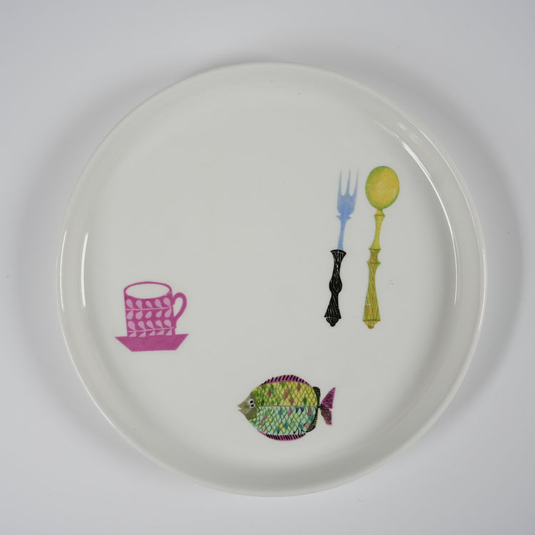 This cake plate is part of the Pynta series, designed in 1962 by Gustavsberg, a long-established Swedish ceramics manufacturer. "Pynta" is a Swedish word meaning "decoration" or "ornament." The surface features designs of trees, radishes, wine bottles, and pencils.