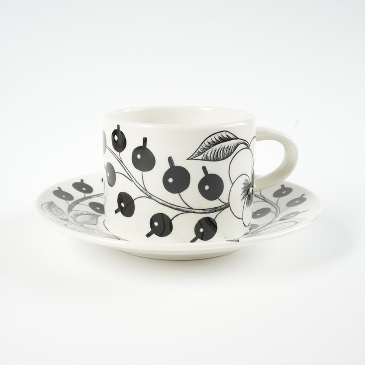 This is a Paratiisi teacup and saucer from Arabia, a famous brand produced between 1969 and 1974. This is a vintage black and white Paratiisi, produced in small batches for two years starting in 1972. This is a black and white series made without glaze, using only outlines to reduce the effort required for decoration.