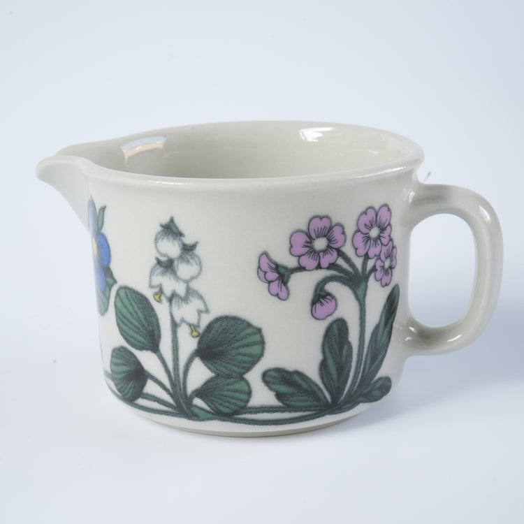 This creamer is part of the classic Flora series, released in 1979 by ARABIA, Finland's leading tableware manufacturer. It features beautiful natural floral designs, including dandelions, pansies, and lilies of the valley, all over the piece, including the backstamp. The form was designed by Ulla Procoppe, a renowned Valencian, while the decorative pattern was created by Esteri Tomura, renowned for her work on Crocus. This is a masterpiece by two legendary ARABIA designers.