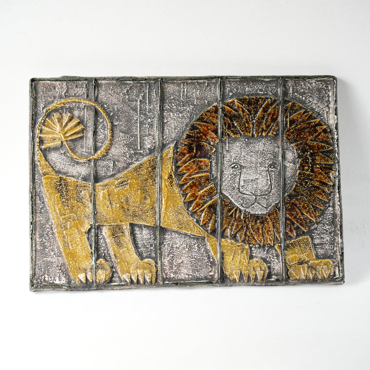 This is a lion ceramic tile produced by Lisa Larson in 1963 for Gustavsberg in a limited edition of 100 pieces. It depicts a lion in a cage. In addition to the line that produced mass-produced products, Gustavsberg had a department called G-Studion where famous designers such as Stig Lindberg and Lisa Larson produced art works. This is a work made in that atelier. The signature of LISA. L. is engraved on the bottom left.