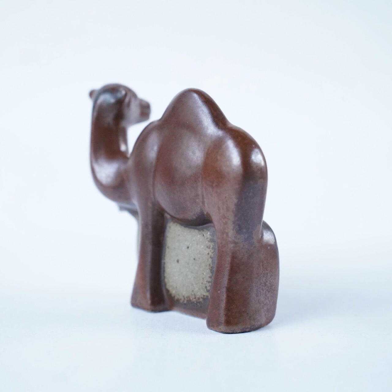 本作はぴったりと寄り添う二頭のひとこぶらくだがデザインされています。手前側のメスは落ち着いた幸せな表情をしている反面、背景のオスは首を伸ばし警戒を怠らない表情をしています。仲睦まじい夫婦の姿が表現されています。底面にはリサ・ラーソンの作であることの証としてイニシャルのLが刻印されています。