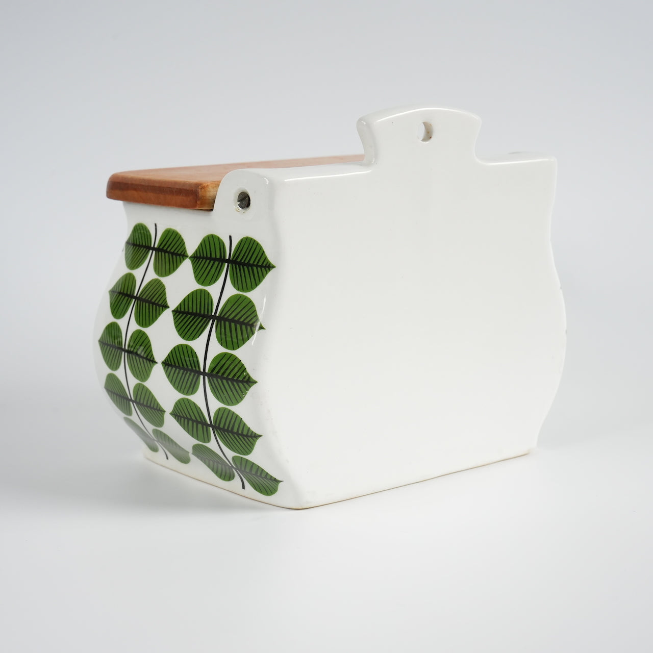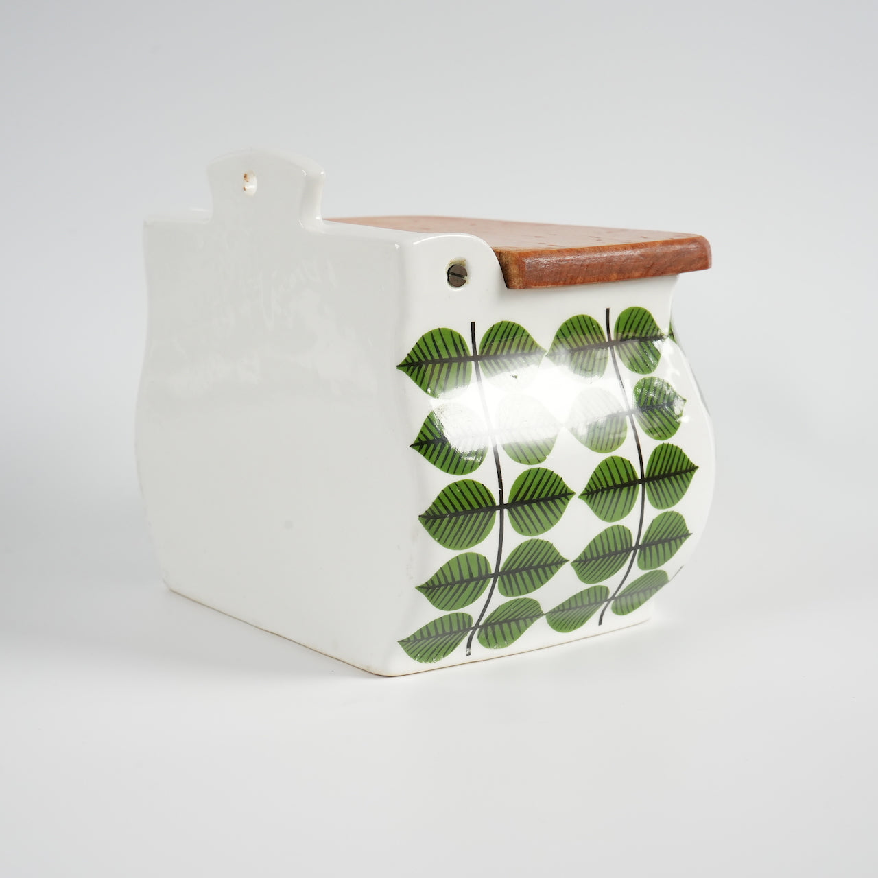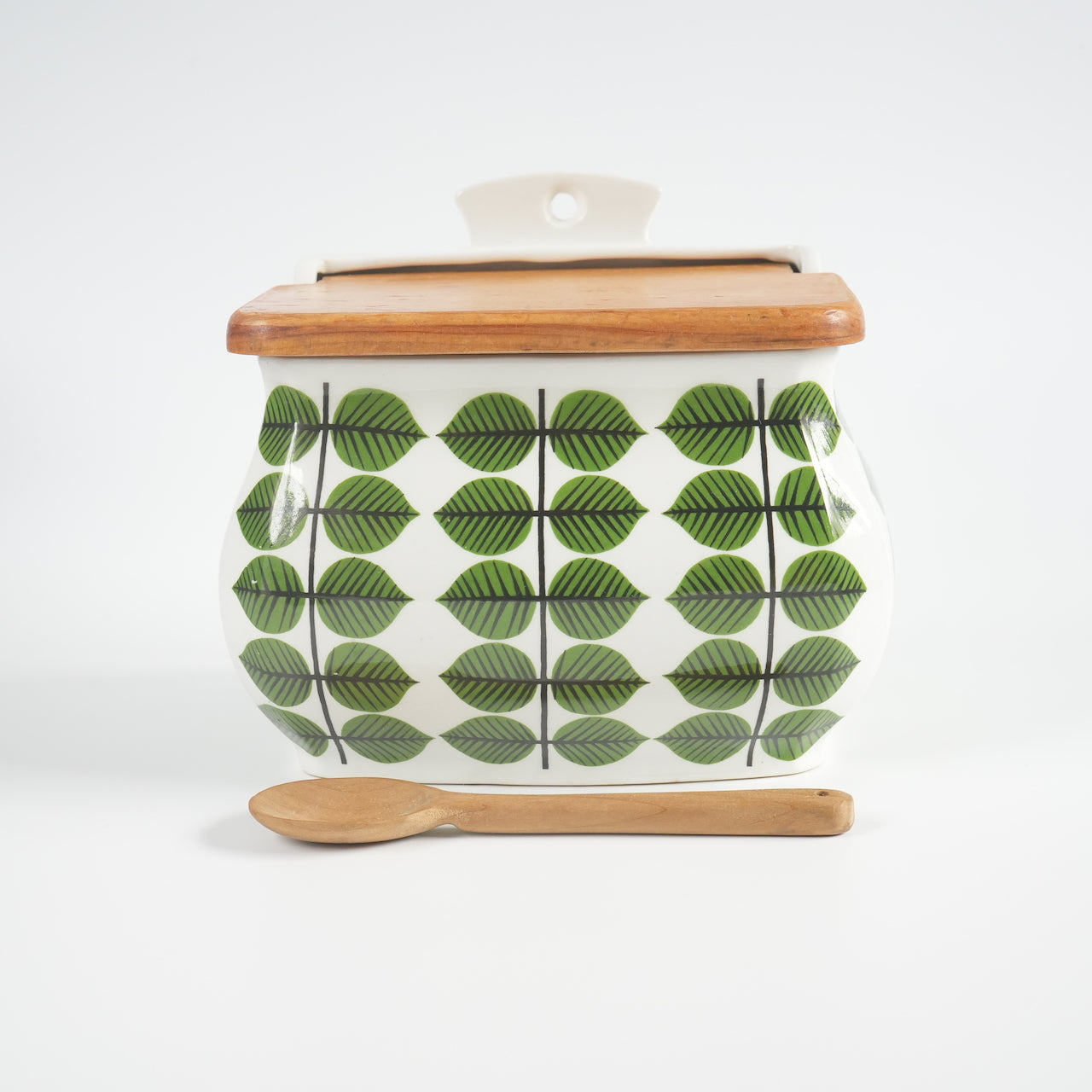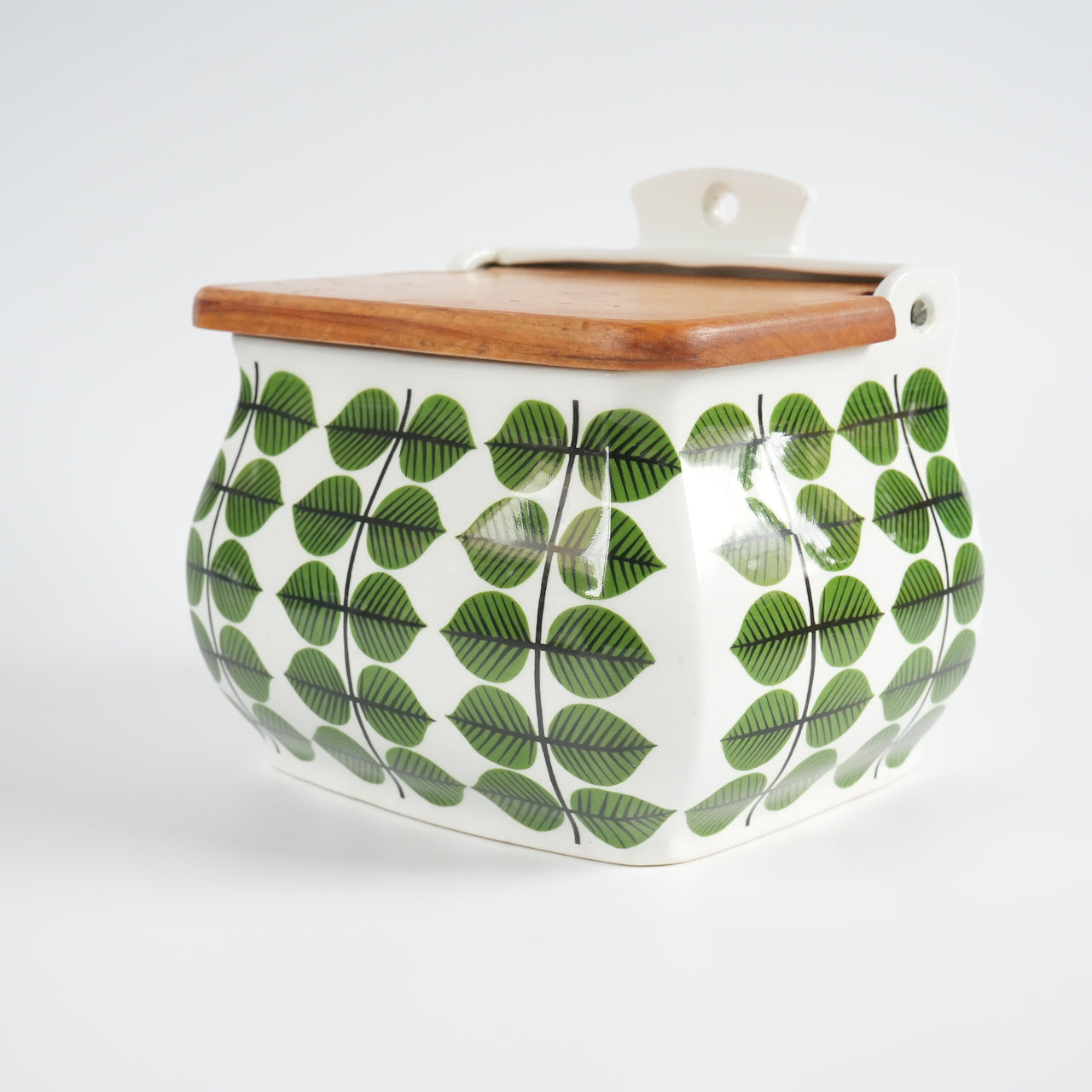 白磁のボディに、ベルサらしいグリーンの葉が端正に反復し、直線的な茎のラインが全体をきりっと引き締めています。そこに木製のふたが合わさることで、白・緑・木肌のバランスが完成しています。壁掛け用の穴が設けられているため、キッチンの壁面で“見せる収納”として成立するのも魅力です。