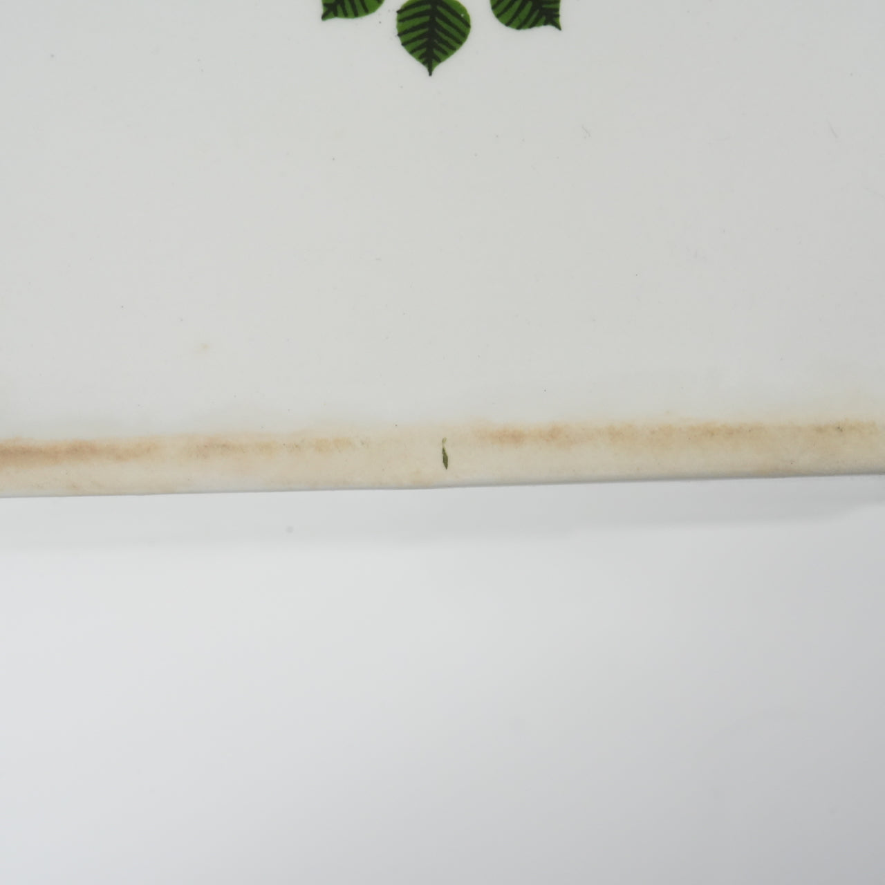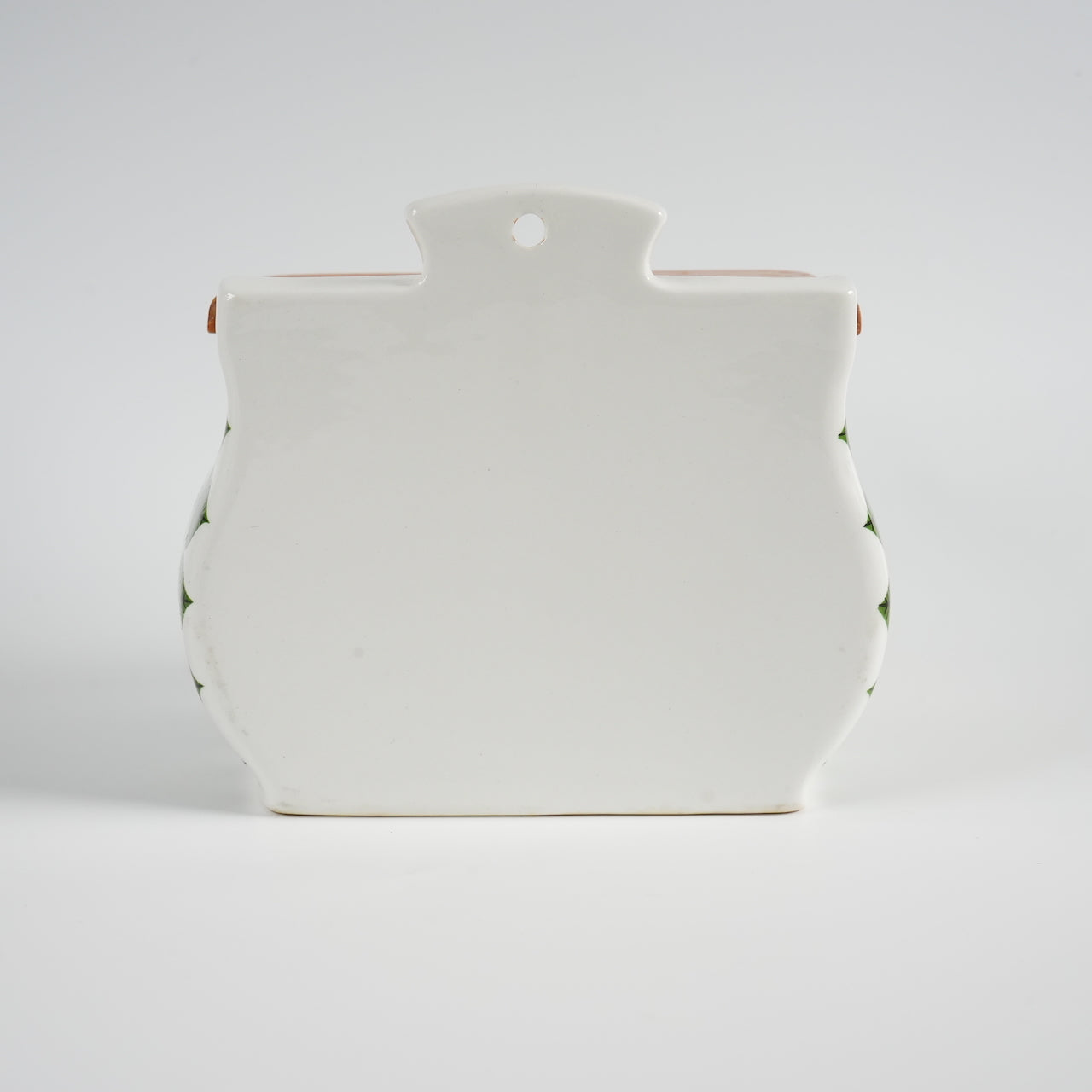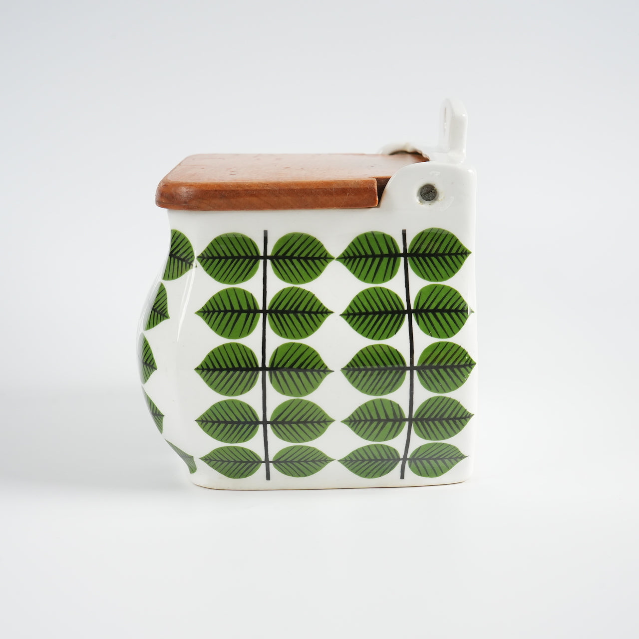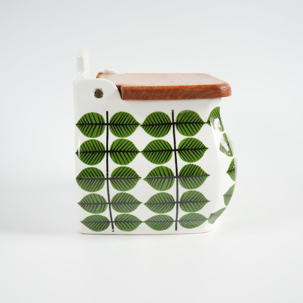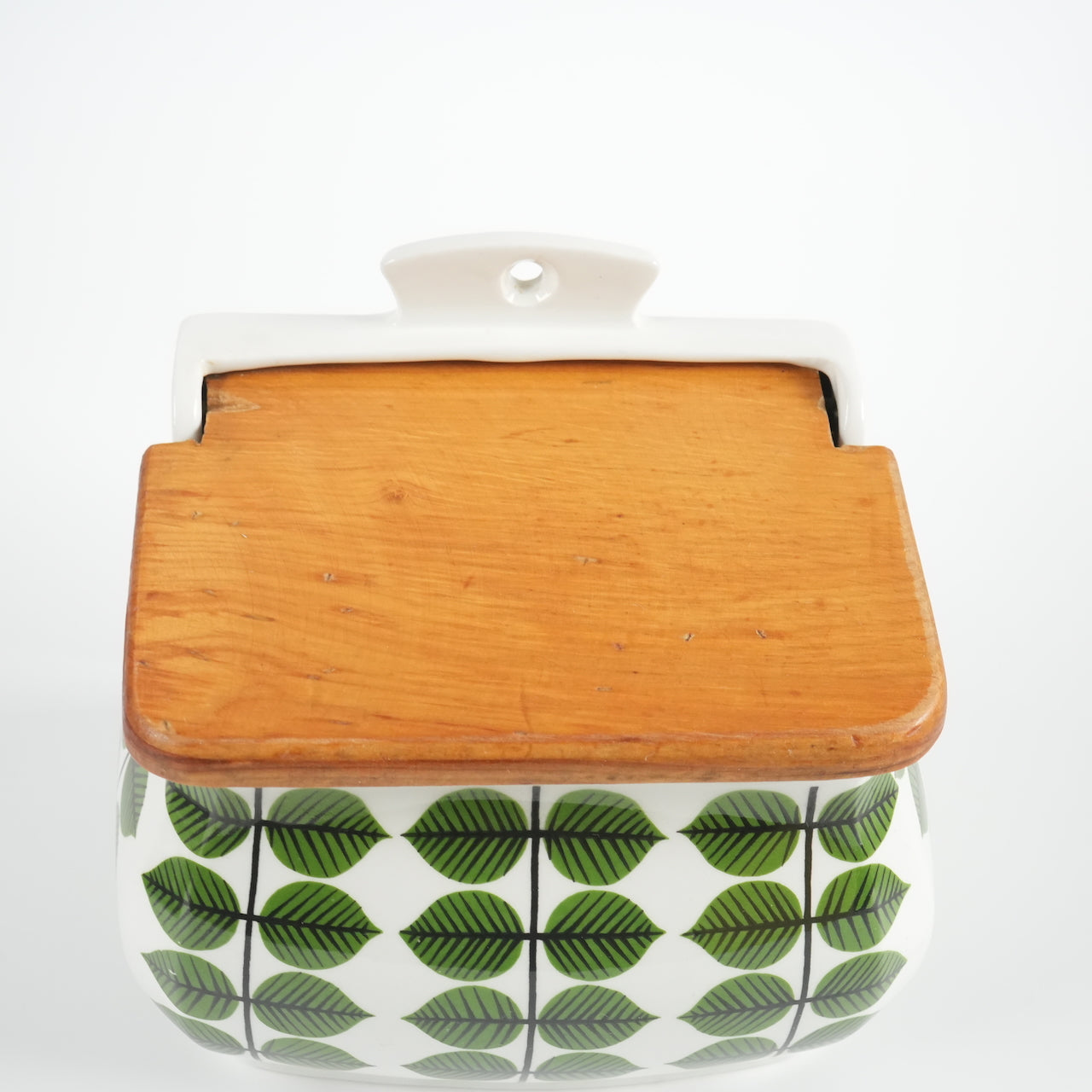 白磁のボディに、ベルサらしいグリーンの葉が端正に反復し、直線的な茎のラインが全体をきりっと引き締めています。そこに木製のふたが合わさることで、白・緑・木肌のバランスが完成しています。壁掛け用の穴が設けられているため、キッチンの壁面で“見せる収納”として成立するのも魅力です。