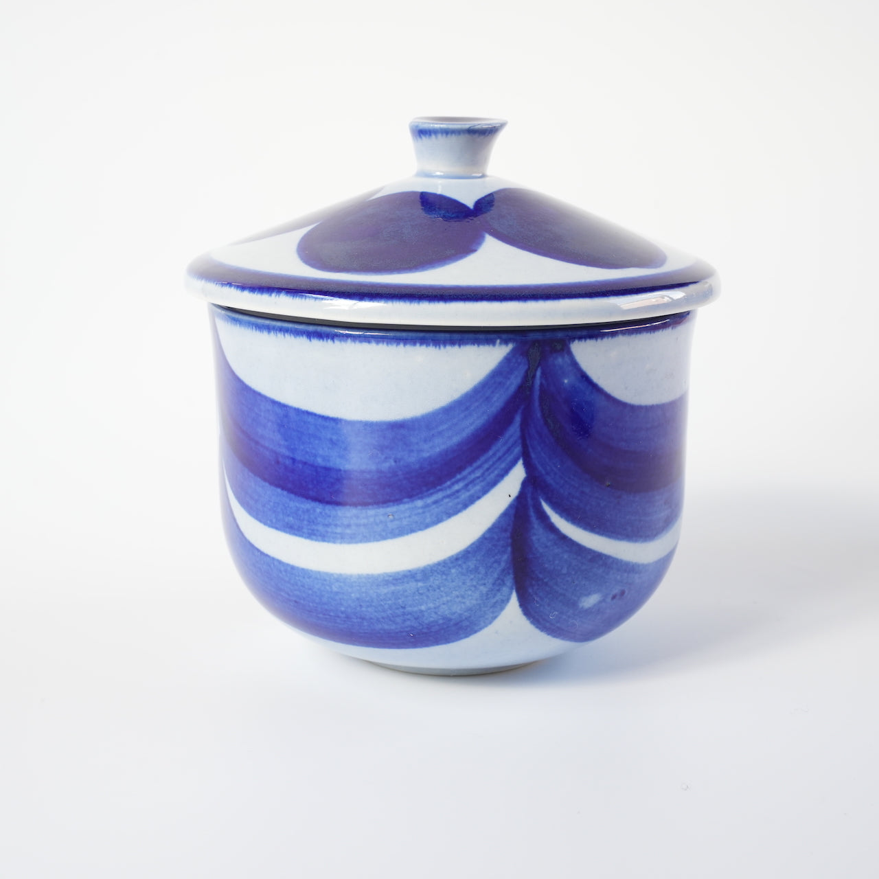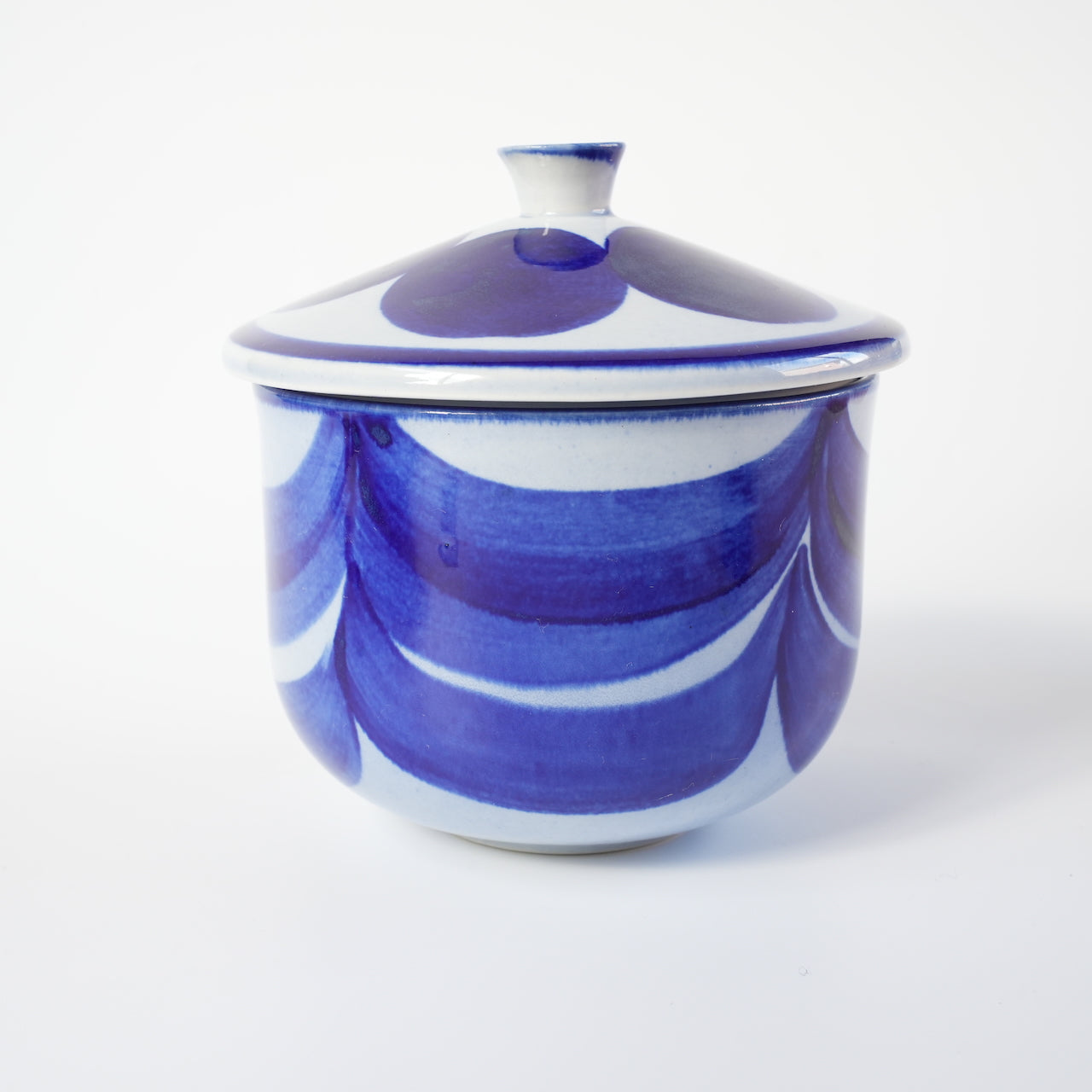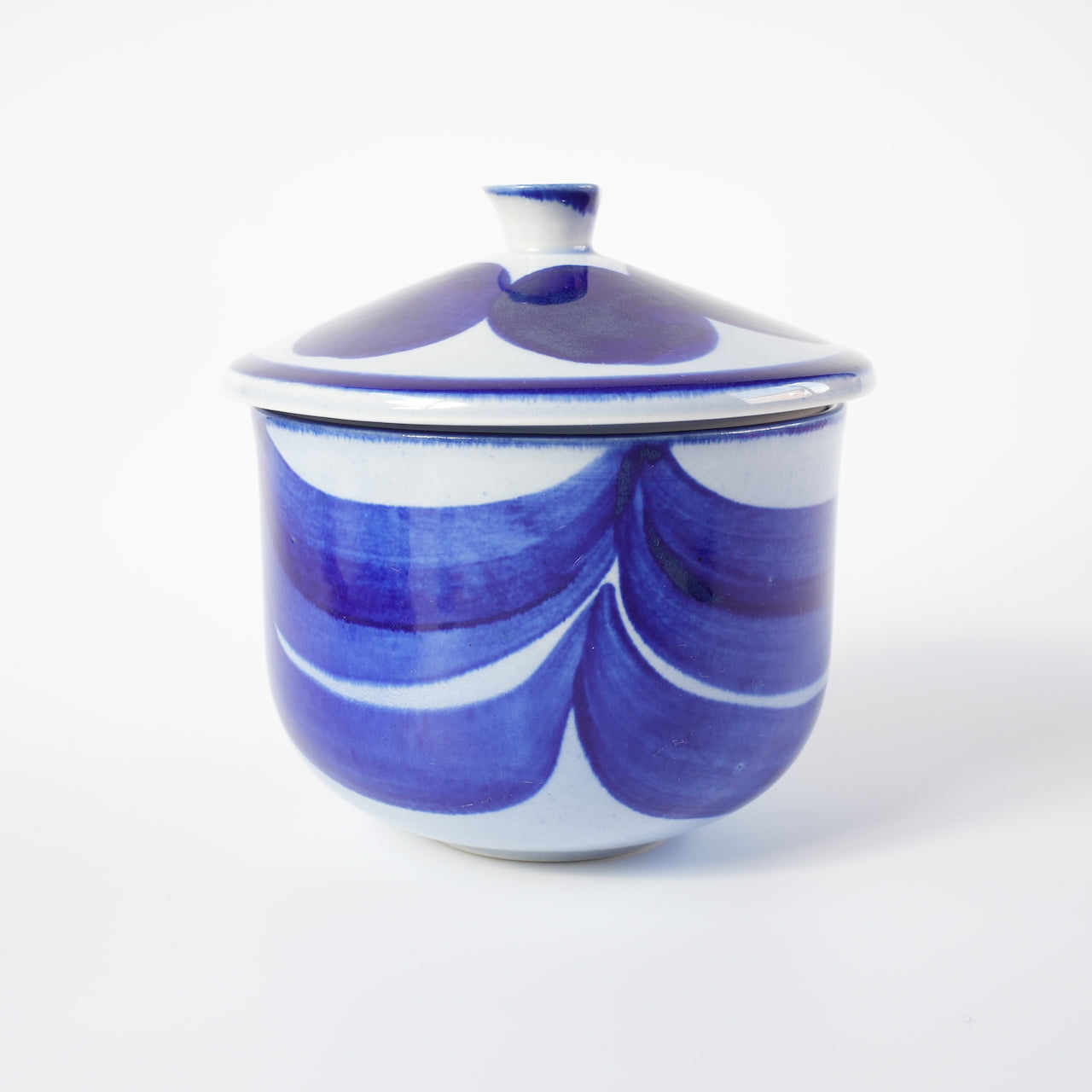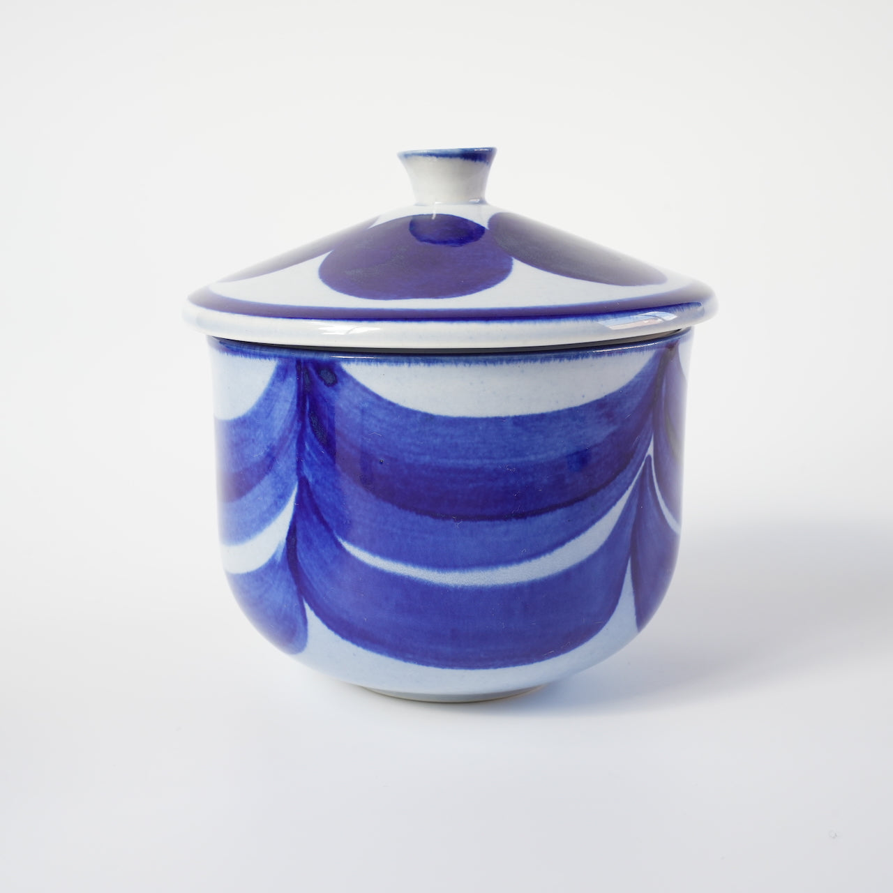 リサ・ラーソンが1993年にグスタフスベリ社内に構えた工房「Kスタジオ」で制作した、ハンドペイントの大柄なシュガーボウルです。丸々とした胴に、勢いのあるコバルトブルーがのびやかに回り、白磁の余白を残しながら大胆に構成されています。筆の運びがそのまま器の表情になっており、同じ図柄でも二つと同じものが生まれない——量産品では得られない“手の跡”を楽しめる一品です。