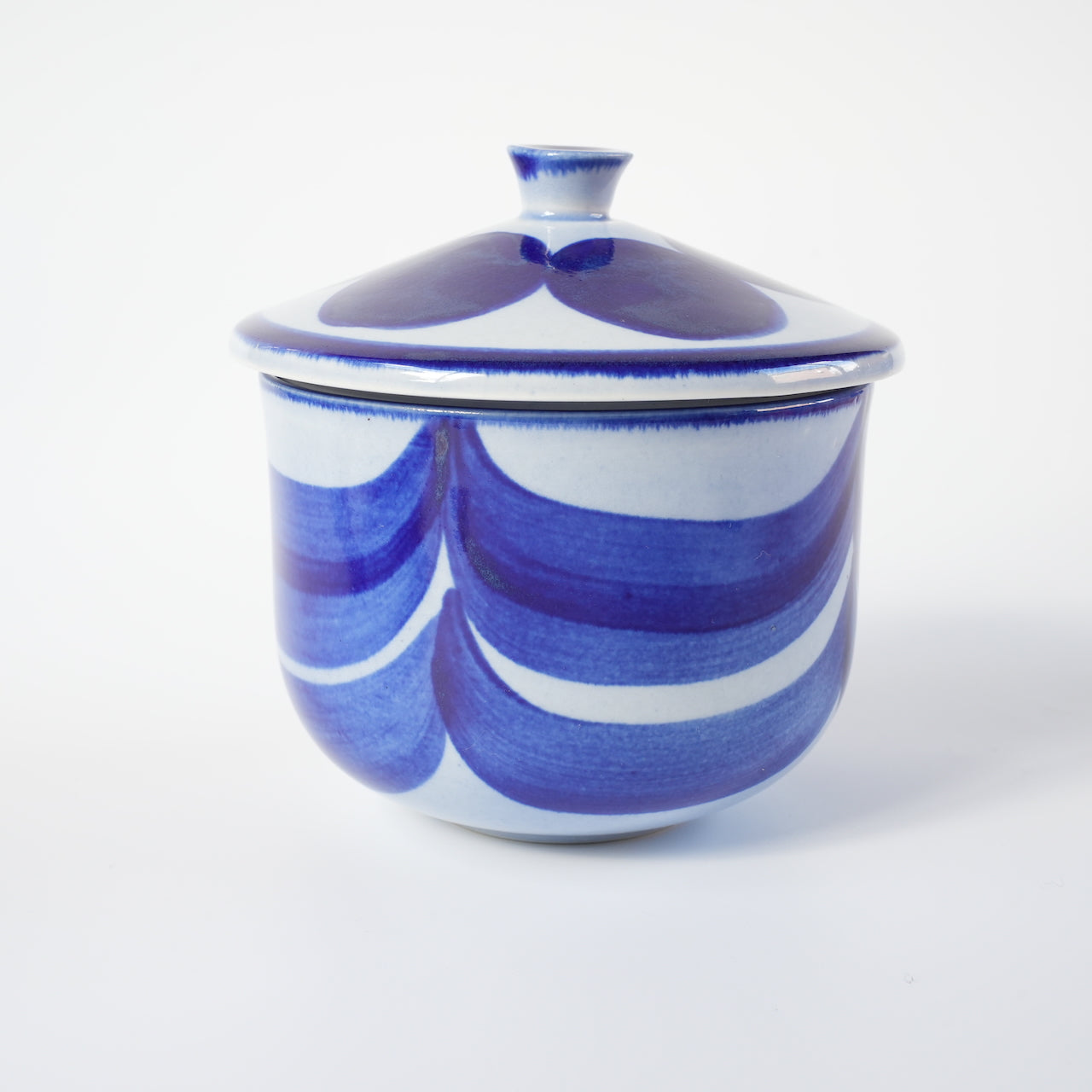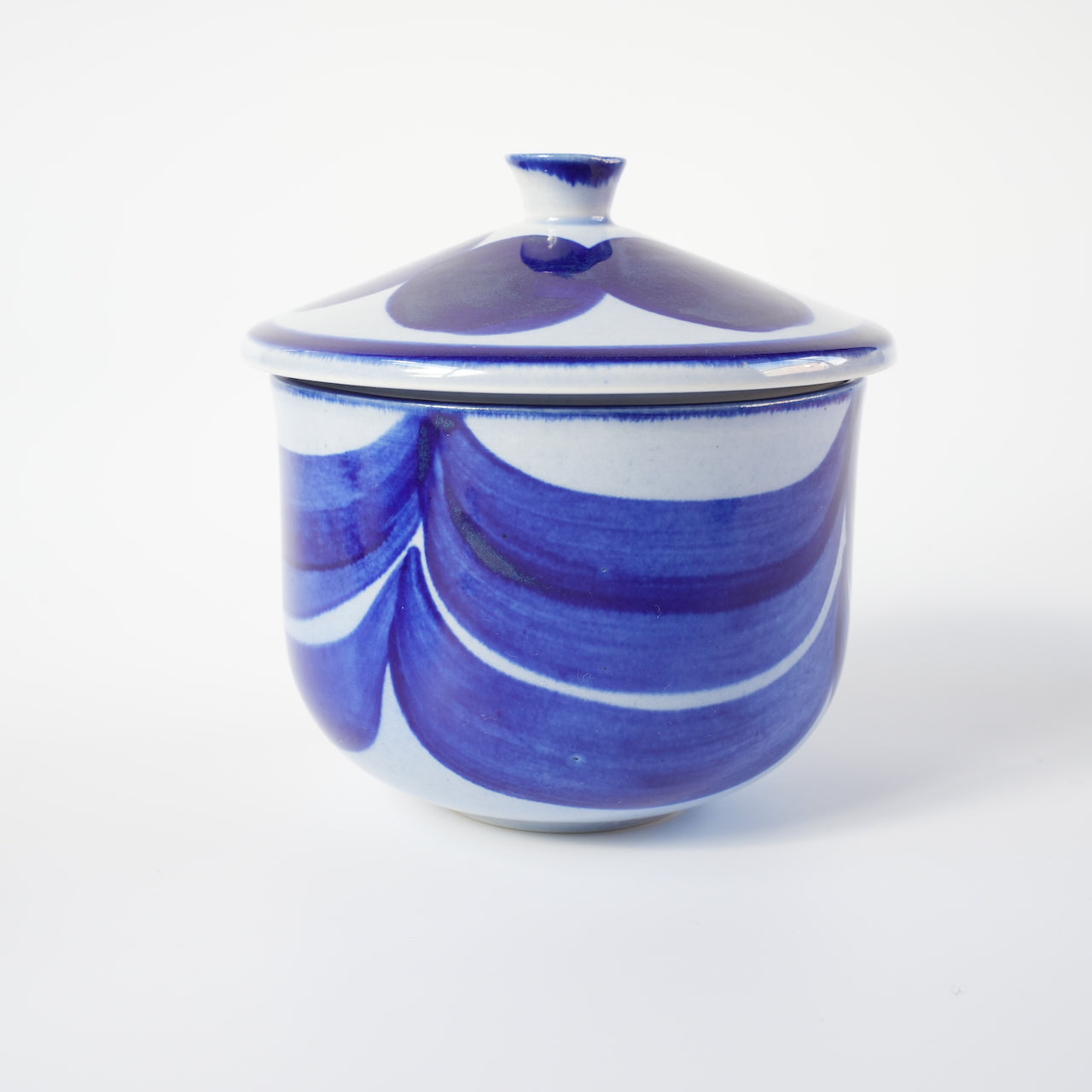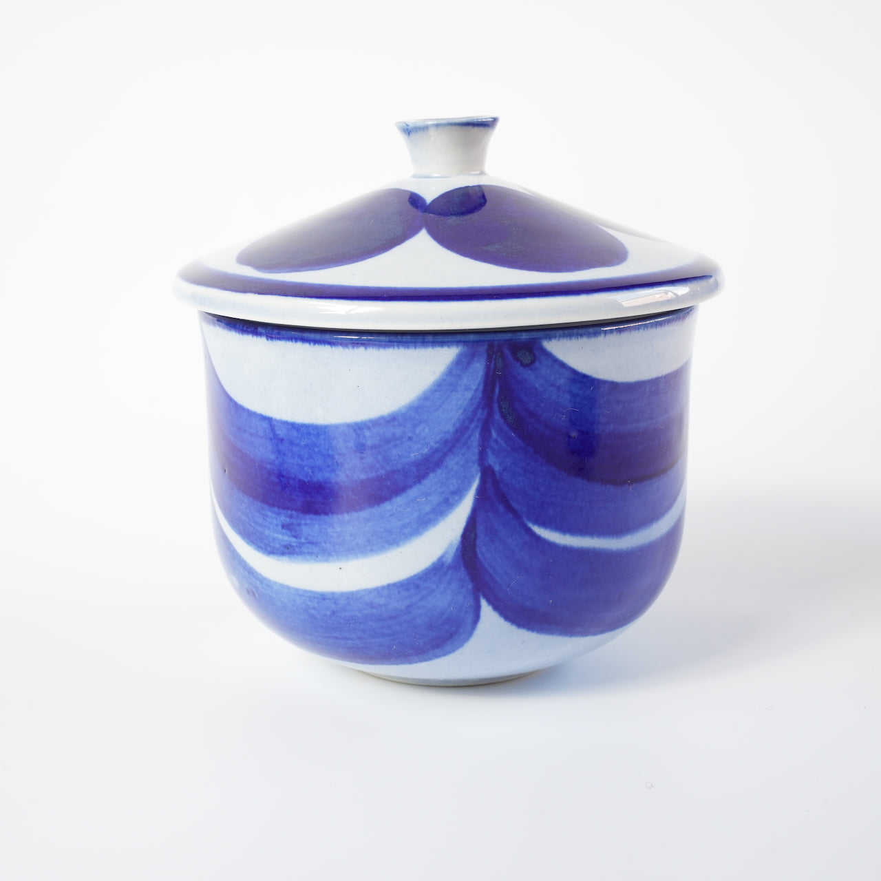 リサ・ラーソンが1993年にグスタフスベリ社内に構えた工房「Kスタジオ」で制作した、ハンドペイントの大柄なシュガーボウルです。丸々とした胴に、勢いのあるコバルトブルーがのびやかに回り、白磁の余白を残しながら大胆に構成されています。筆の運びがそのまま器の表情になっており、同じ図柄でも二つと同じものが生まれない——量産品では得られない“手の跡”を楽しめる一品です。