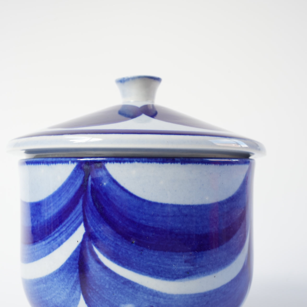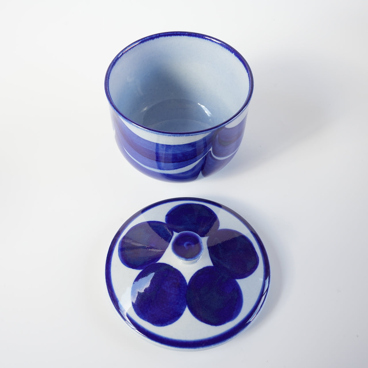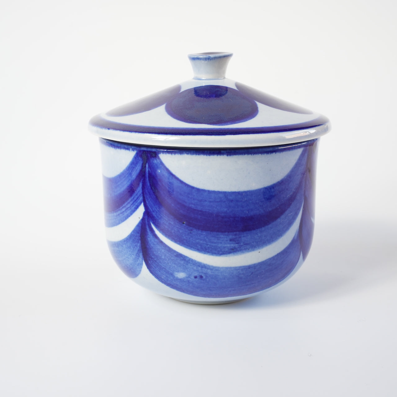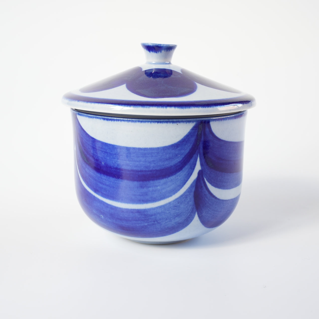リサ・ラーソンが1993年にグスタフスベリ社内に構えた工房「Kスタジオ」で制作した、ハンドペイントの大柄なシュガーボウルです。丸々とした胴に、勢いのあるコバルトブルーがのびやかに回り、白磁の余白を残しながら大胆に構成されています。筆の運びがそのまま器の表情になっており、同じ図柄でも二つと同じものが生まれない——量産品では得られない“手の跡”を楽しめる一品です。