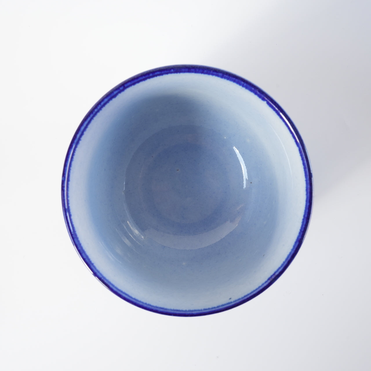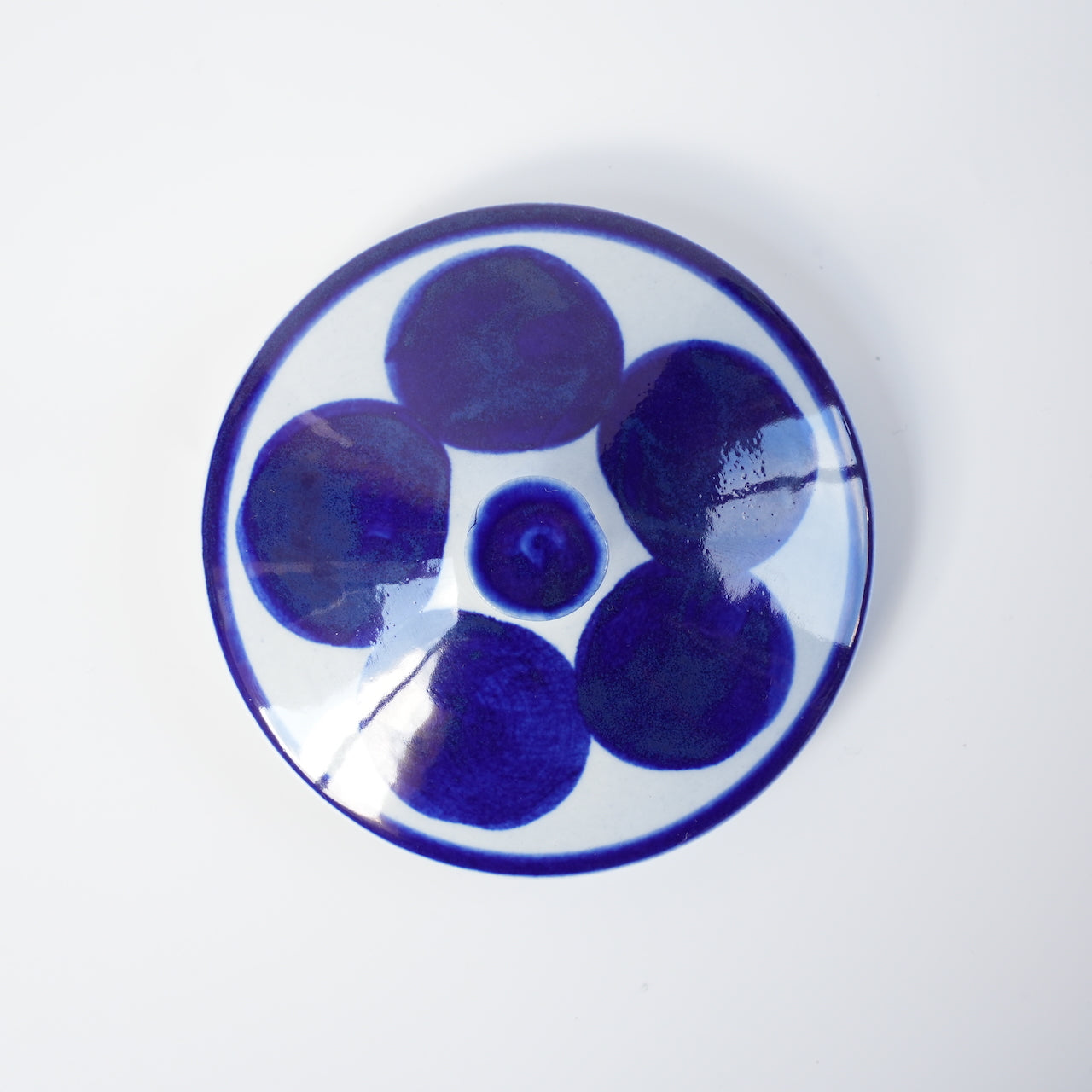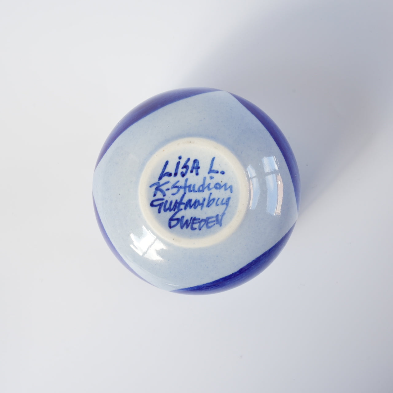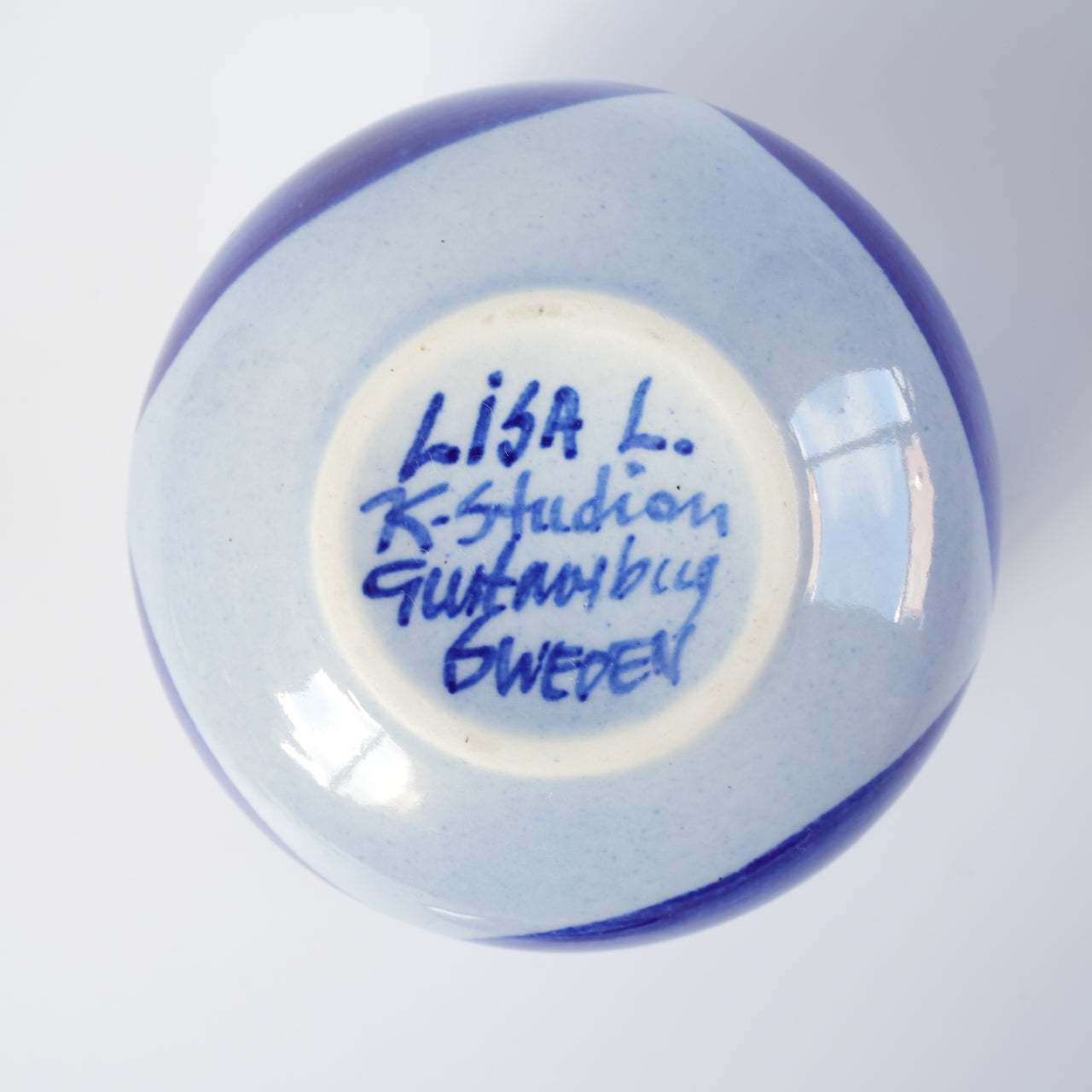 リサは1979年にいったんグスタフスベリを離れたのち、創作に専念できる環境を整えられ、再び同社に迎え入れられました。世界的な作家となったのちの“工房での再出発”とも言える時期に生まれたのが、このKスタジオ作品群です。1990年代のリサ作品は、ミッドセンチュリー期とは異なる成熟した製陶技術を背景に、釉薬の透明感や発色、白の余白の扱いまで含めて、より自由に陶を試す時代でした。本作の青と白のコントラストは、グスタフスベリ時代の名作を思わせる爽やかさを持ちながら、より洗練された“抜け”があり、現代の食卓やジャパンディの空間にもよく映えます。