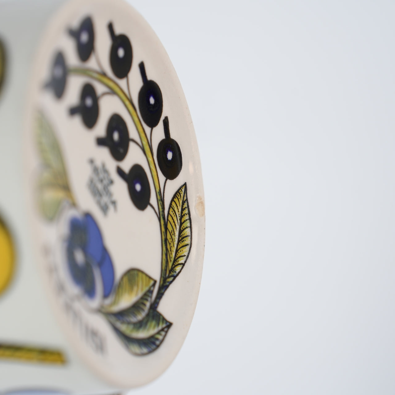 1971年頃に製造されたARABIA社の名器パラティッシの初期のティーカップ&ソーサーです。Paratiisi(パラティッシ)とはフィンランド語で「楽園」の意味です。同社の代表的なデザイナーであったビルガー・カイピアイネンがデザインし、1969年に発売されました。パラティッシは制作に手間がかかるため、1974年には一旦生産が中止されています。わずか5年間の間で、ロゴは2回変わっていますが、こちらは最初期のヴィオラが描かれたロゴとなります。
