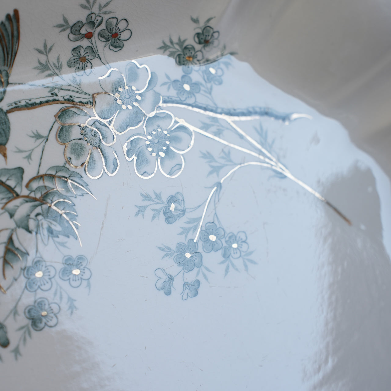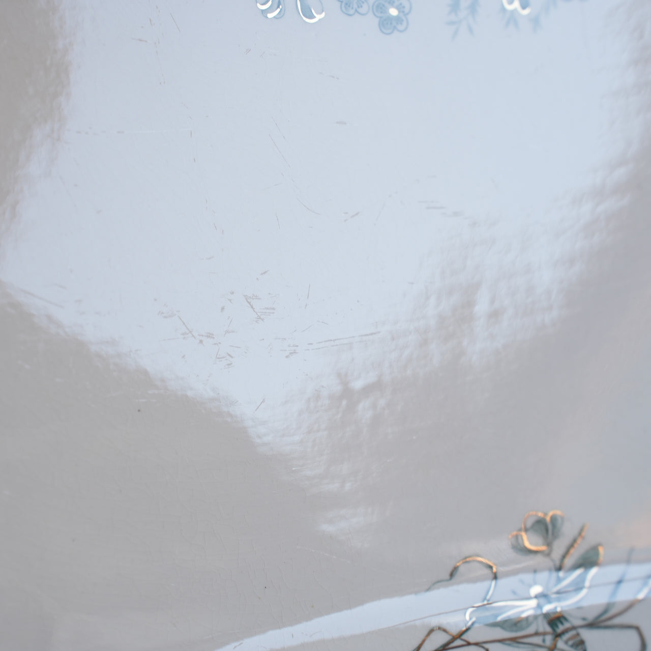 光に透かすと表面にわずかなスレが見られますが、図案の発色と金彩の雰囲気がよく残っており、全体として美しい印象を保っています。
