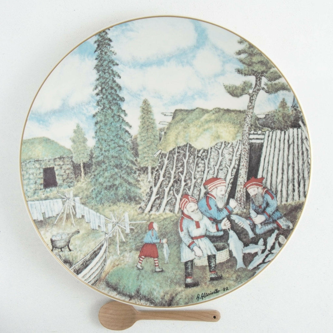 フィンランドを代表する陶器メーカーARABIA社が限定7,000枚製造した記念プレートです。ラップランド出身の画家アンドレアス・アラリエスト(1900-1989)という人物の絵画をプレートにしたものです。こちらは1980年に製造されたものとなります。1900年頃のラップランドで暮らす先住民族の生活の様子や、狩猟の様子などが描かれています。ラップランドとは北欧のノルウェー、スウェーデン、フィンランド、そしてロシアの一部にまたがる北方の地です。北極圏に入る極寒の地で、当地で暮らす先住民はサーミと呼ばれます。作者のアラリエスト自身もサーミの出身で、民族誌の記録としてスケッチしたものがプレートに収められています。30cm近いサイズのある大皿で、金縁のプレートのなかに当時の人々の暮らしが活写されています。こちらは冬に備えてニシンを保存食にする風景が描かれています。背面にはフィンランド語、スウェーデン語、ドイツ語、英語の4言語が併記されています。