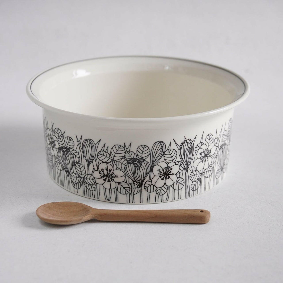 北欧フィンランドを代表する食器メーカーARABIA社の名作クロッカスの大きな18.5cmボウルです。シリーズ名のクロッカスとはアヤメ科の植物の一種です。デザインを担当したのはフローラやヴァルムやボタニカなどで知られ、自然の草花をデザインに織り込むのを得意としたエステリ・トムラです。クロッカスシリーズには白黒版、カラー版、白黒のグレーリム版の3種類がありますが、こちらは白黒版となります。クロッカスは1978~79年のわずか2年間しか製造されなかった商品です。ボウルは近年復刻版も販売されていますが、フォルムが異なり、口が外向きに沿っており全体的に復刻版よりも洗練されたラインとなっています。また白黒版は復刻がされておらずヴィンテージでしか入手することができません。