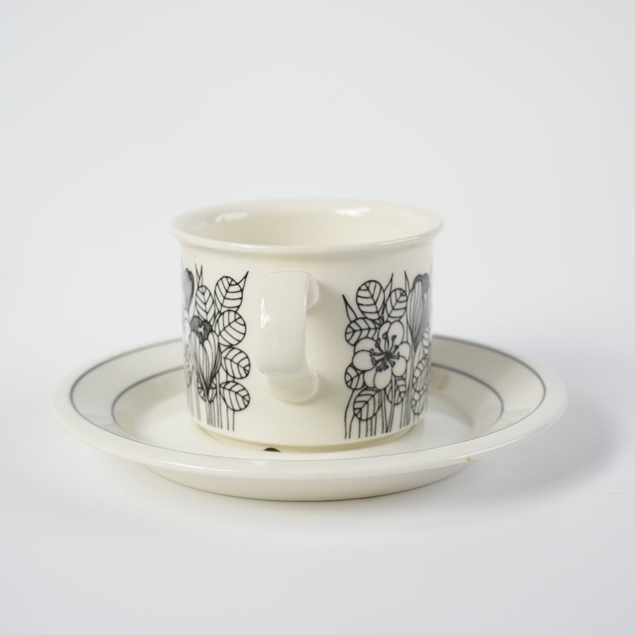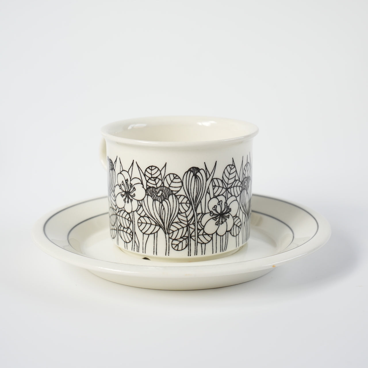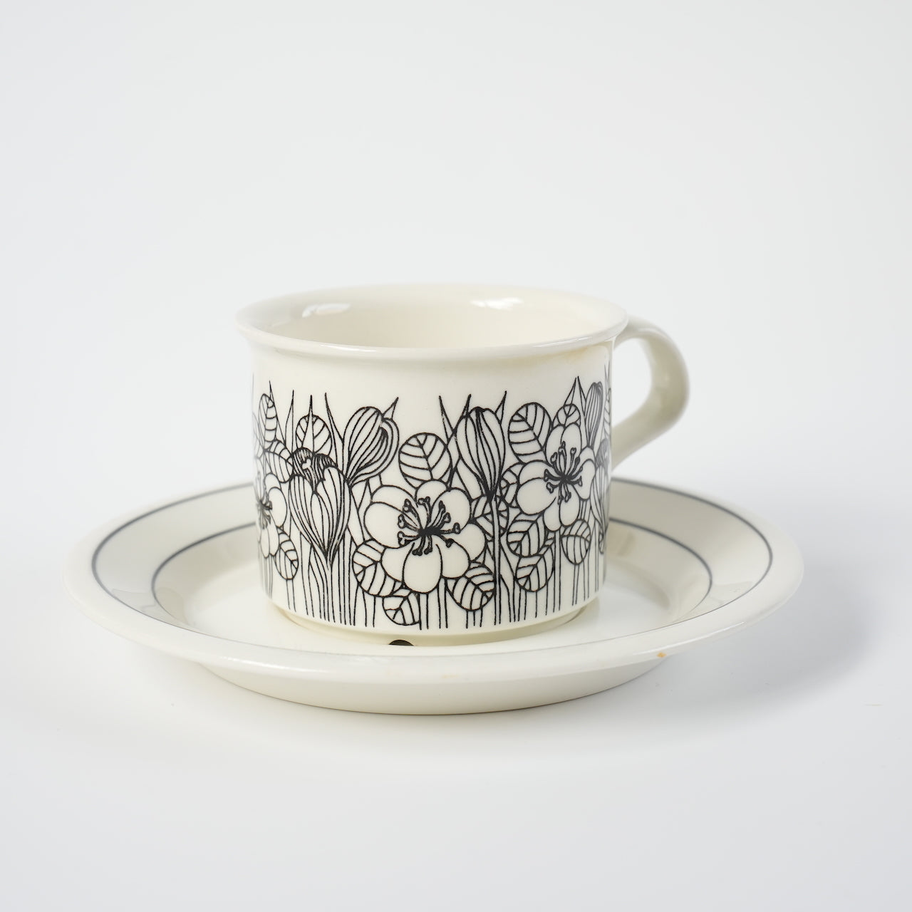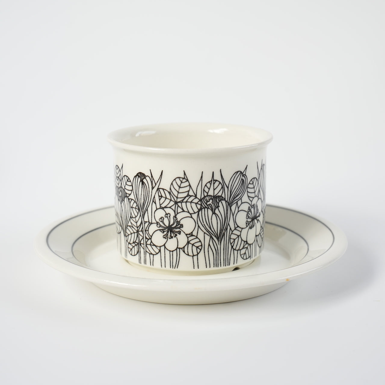 クロッカスシリーズには白黒版、カラー版、白黒のグレーリム版の3種類がありますが、こちらは比較的希少性の高い白黒版となります。クロッカスは1978~79年のわずか2年間しか製造されなかった商品です。近年復刻版も販売されていますが、フォルムが甘かったり、オリジナルにはなかったマグカップでの復刻でヴィンテージと一定の違いがあります。こちらのコーヒーカップ&ソーサーはヴィンテージ市場でしか入手できず、年々その希少性は高まっています。