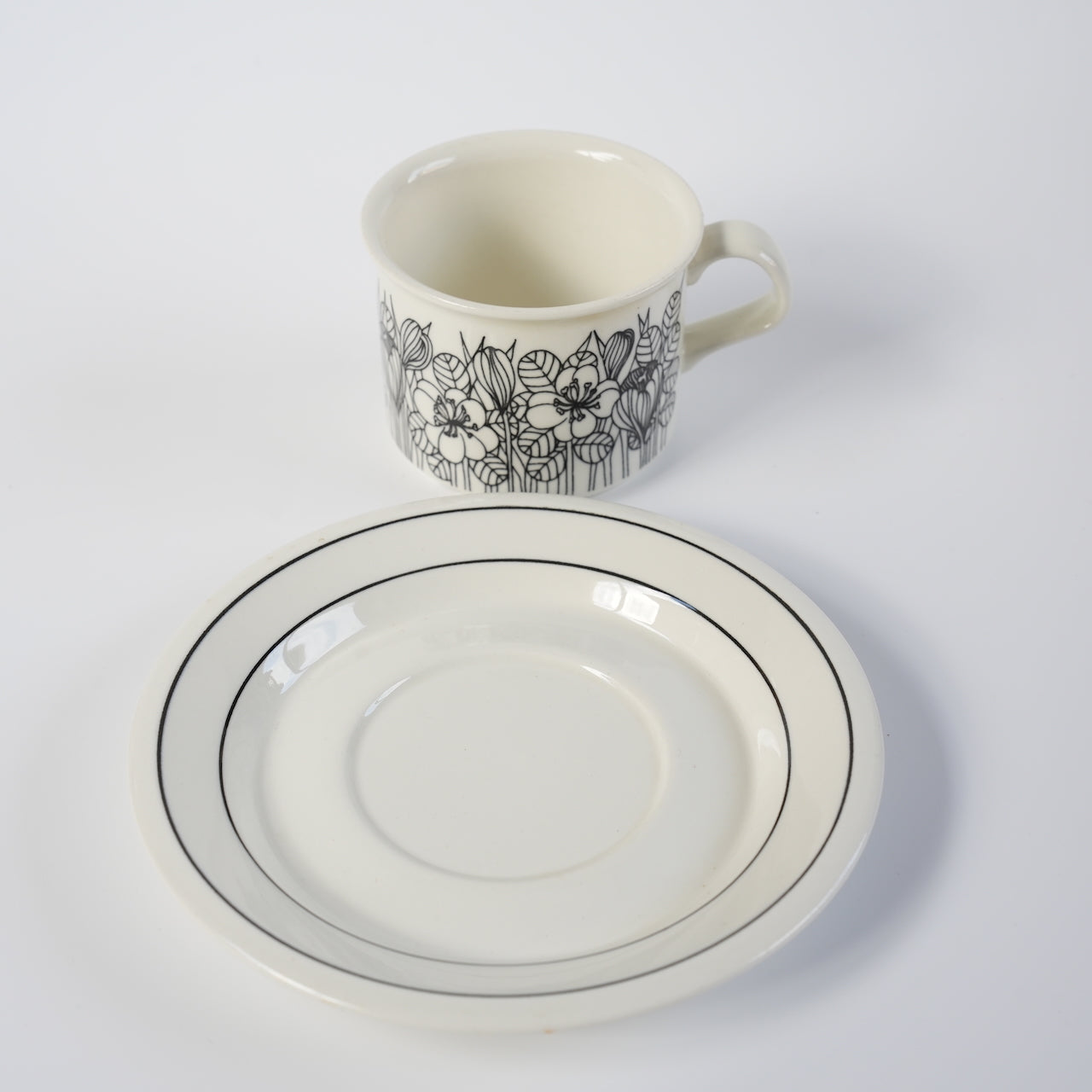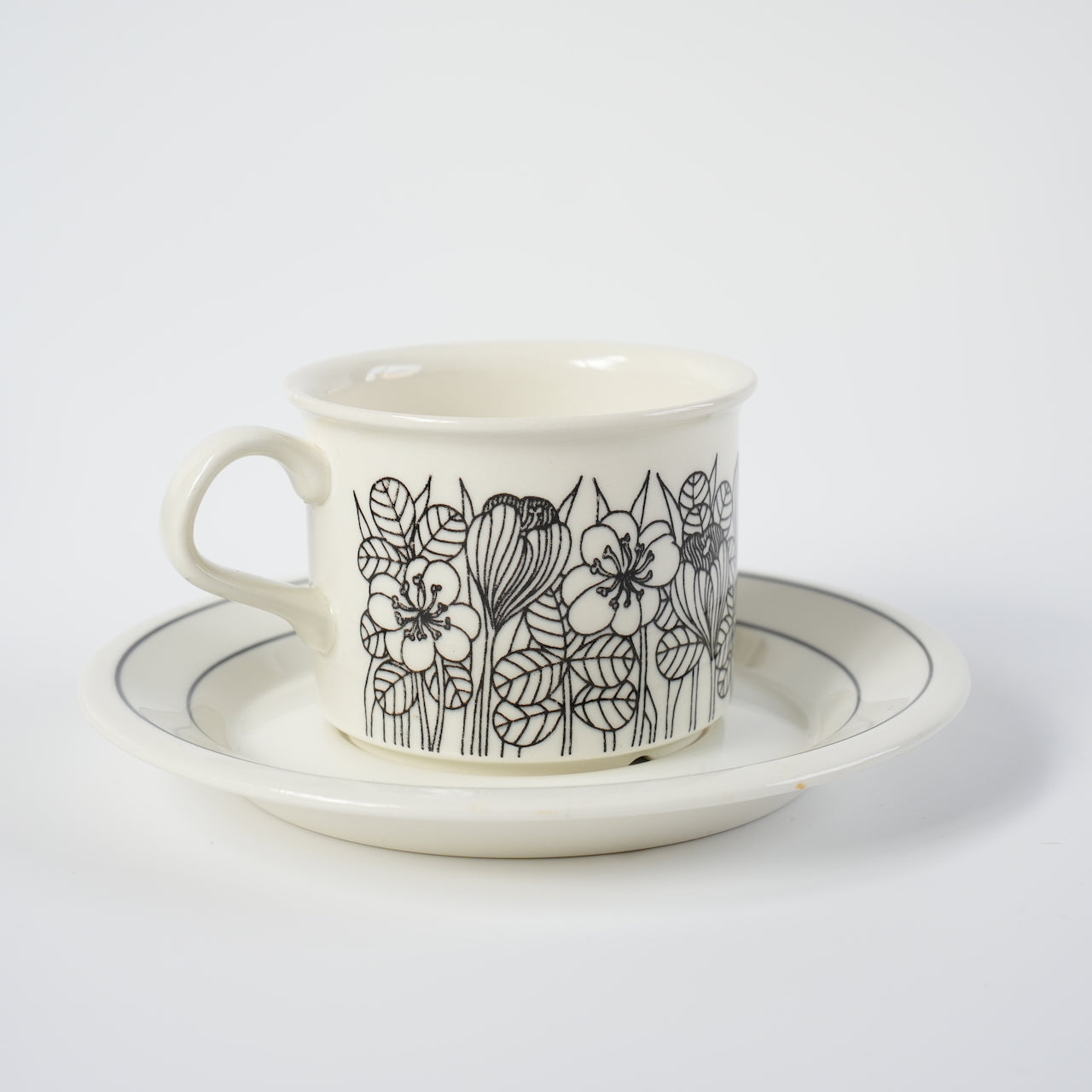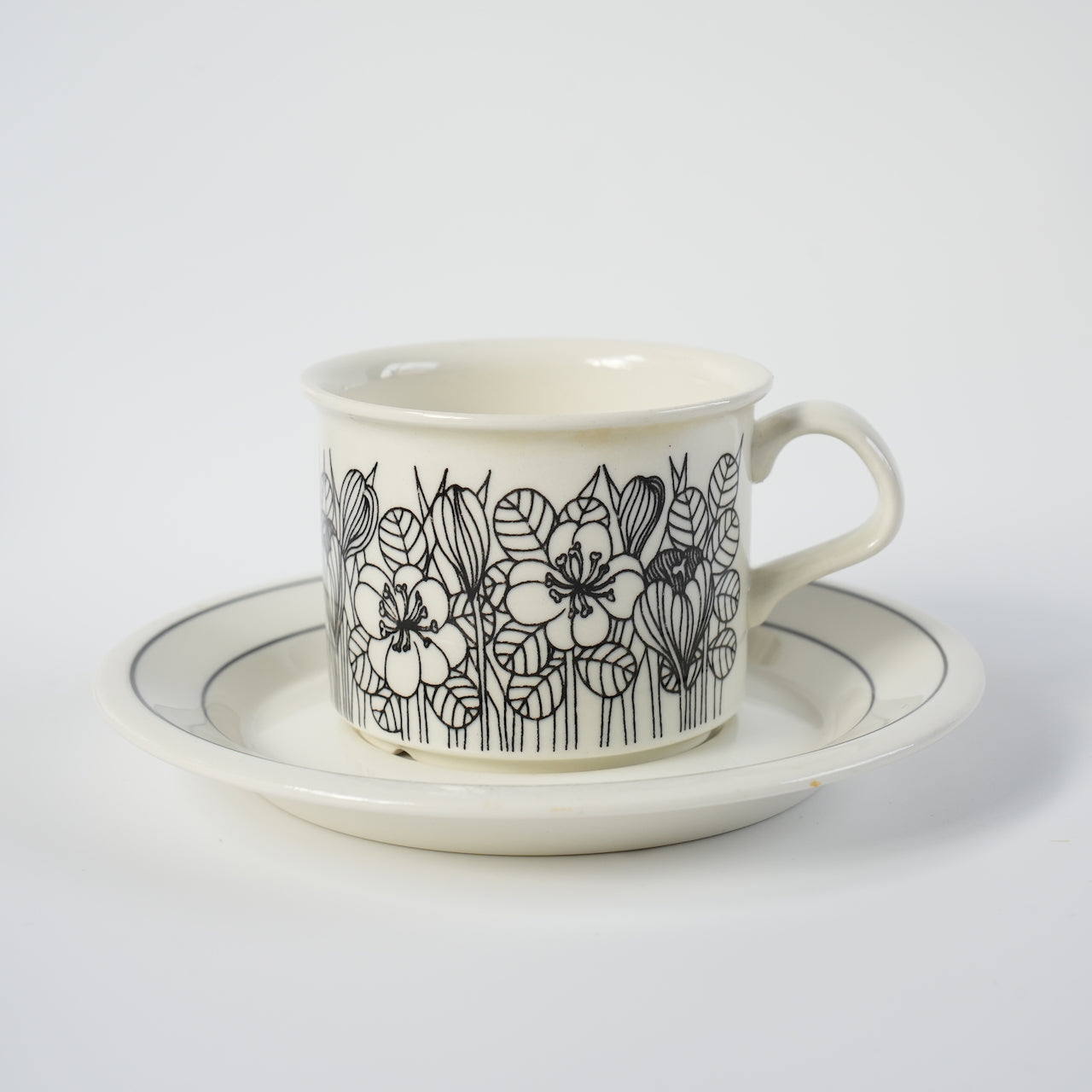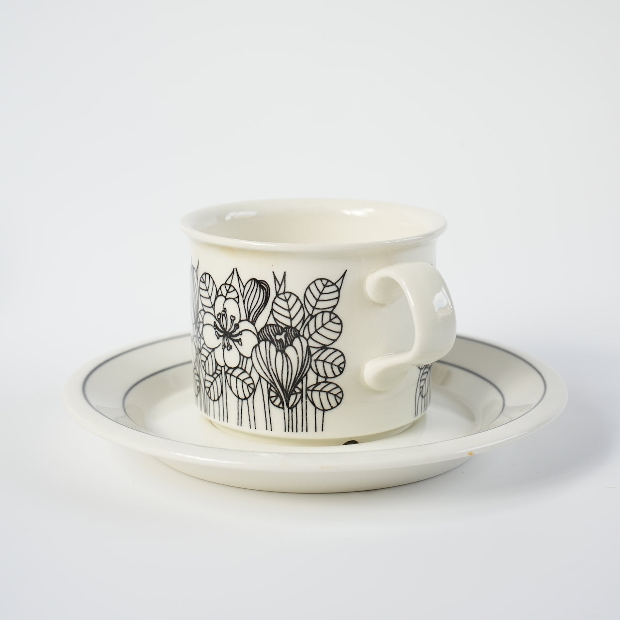 クロッカスシリーズには白黒版、カラー版、白黒のグレーリム版の3種類がありますが、こちらは比較的希少性の高い白黒版となります。クロッカスは1978~79年のわずか2年間しか製造されなかった商品です。近年復刻版も販売されていますが、フォルムが甘かったり、オリジナルにはなかったマグカップでの復刻でヴィンテージと一定の違いがあります。こちらのコーヒーカップ&ソーサーはヴィンテージ市場でしか入手できず、年々その希少性は高まっています。