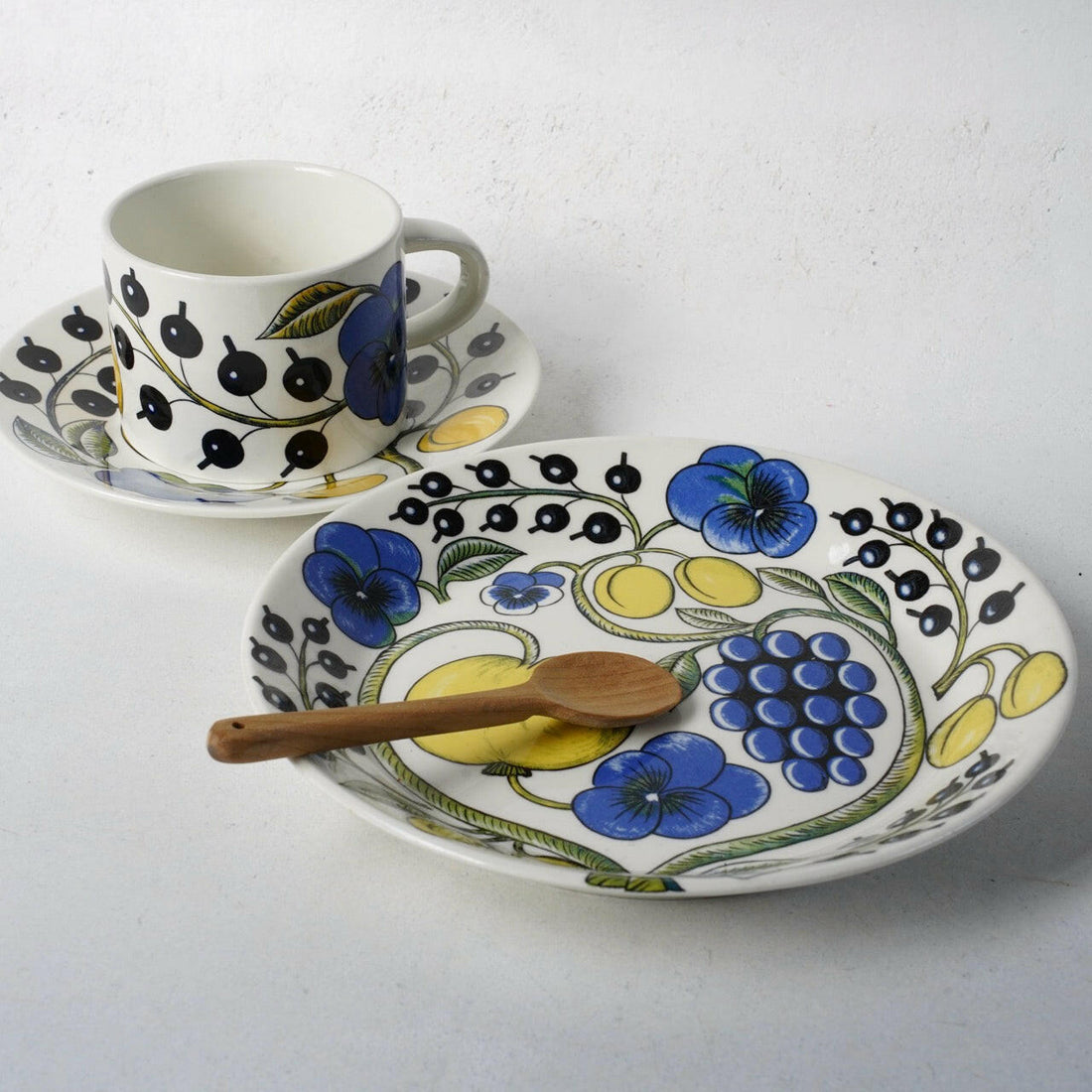 このオルヴォッキメリの延長線上に、1969年、パラティッシは誕生します。元の名前は「タルハ(果樹園)」。ベルギー国王ボードワン夫妻がアラビア工場を訪問した際、完成したばかりのこのデザインに一目惚れ。ファビオラ王妃が自宅用に購入を希望し、「パラティッシ(楽園)」と名付けられました。