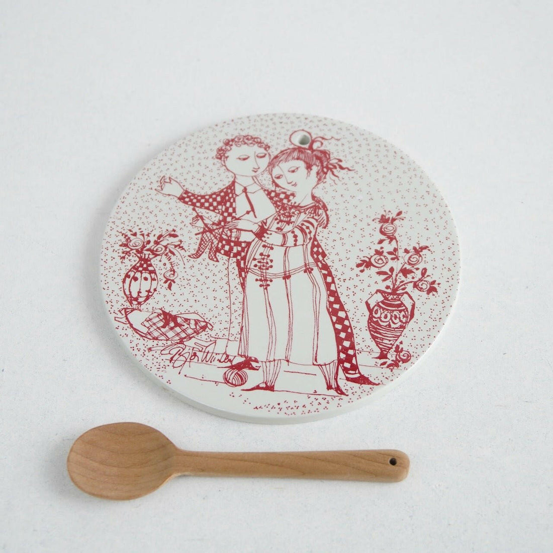 デンマークの窯元ニモールのカッティングボードです。1960年代に製造されたもので、カレンダーのように12ヶ月分のデザインがあるシリーズです。こちらは11月の風景を描いたものです。編み物をする妻に寄り添う夫という夫婦像が描かれています。左下には子供服が描かれ、女性のお腹は心持ち大きく膨らんでおり、これから生まれてくる子どものために編み物をしている様子にも見えます。比較的珍しい丸形のカッティングボードですが、鍋敷きほどの大きさの小ぶりなものです。上部には穴が空いており壁掛けの飾り皿としてもお使い頂けます。