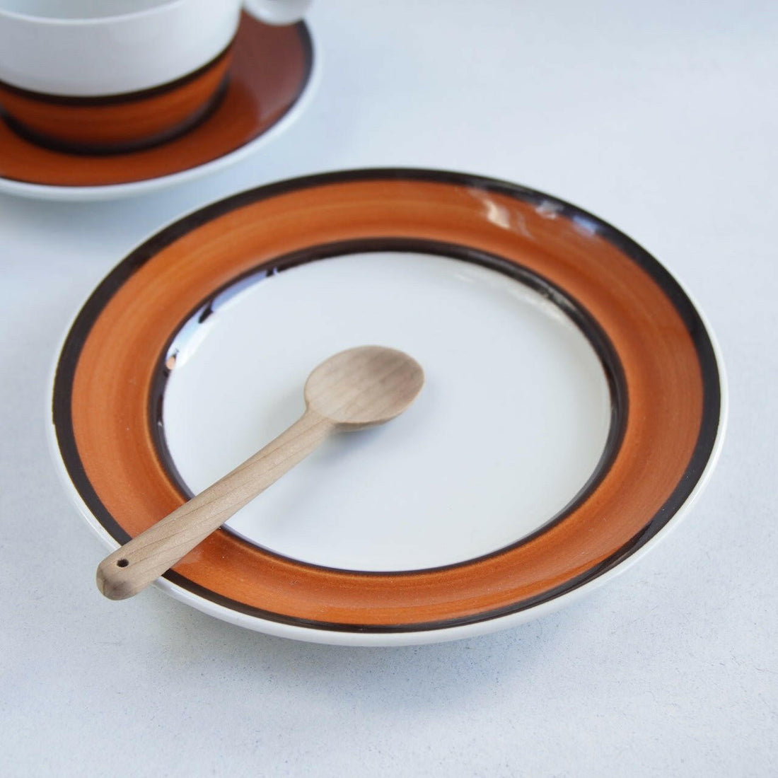 スウェーデンの名窯グスタフスベリ(Gustavsberg)のヴィンテージのプレートです。グスタフスベリ社は絵柄と配色という二つの要素で著名な食器を生み出してきました。本製品アレナは同社の代表的なデザイナーのスティグ・リンドベリ(Stig Lindberg) の手によるものです。同氏のデザインのなかでもアレナはシンプルで、配色の鮮やかさのみで仕上げた器となっています。アレナとは「円形闘技場」という意味で、皿の丸みが闘技場の再現性を持つとともに、ハンドペイントによるオレンジの配色が鮮やかで格闘技の激しさを想起させています。