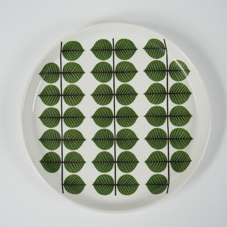 スウェーデンの老舗食器メーカー、グスタフスベリの定番Bersaの24cmサイズのディナープレートです。デザイナーはスウェーデンの巨匠スティグ・リンドベリ(Stig Lindberg) です。リンドベリは1961年にこの葉っぱ柄のデザインを創作しました。Bersa(Berså;ベショー、ベルショー)とは東屋(あずまや)の意味で、公園の一隅などで一休みするために設けられたスペースのことです。冬の日が多い北欧で、新緑の緑を感じられる温かいデザインとなっています。