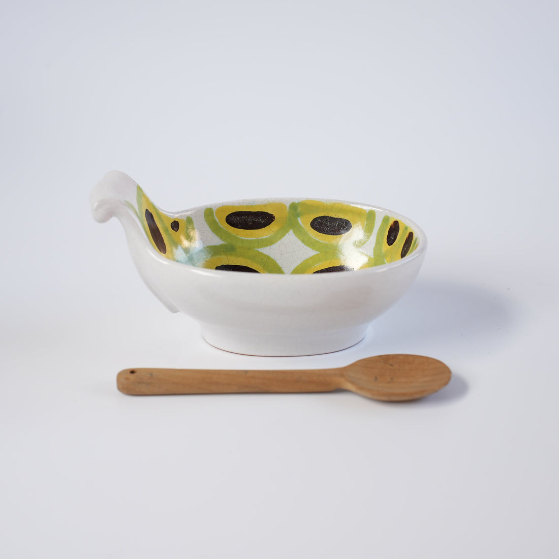 鳥のようなフォルムが愛らしい小皿型のスプーン・レストで、木製スプーンが付属しています。内側には黄緑・黄・黒褐色の連続した円形パターンが手描きで施されており、ファイアンスならではの温かみのある表情が魅力です。