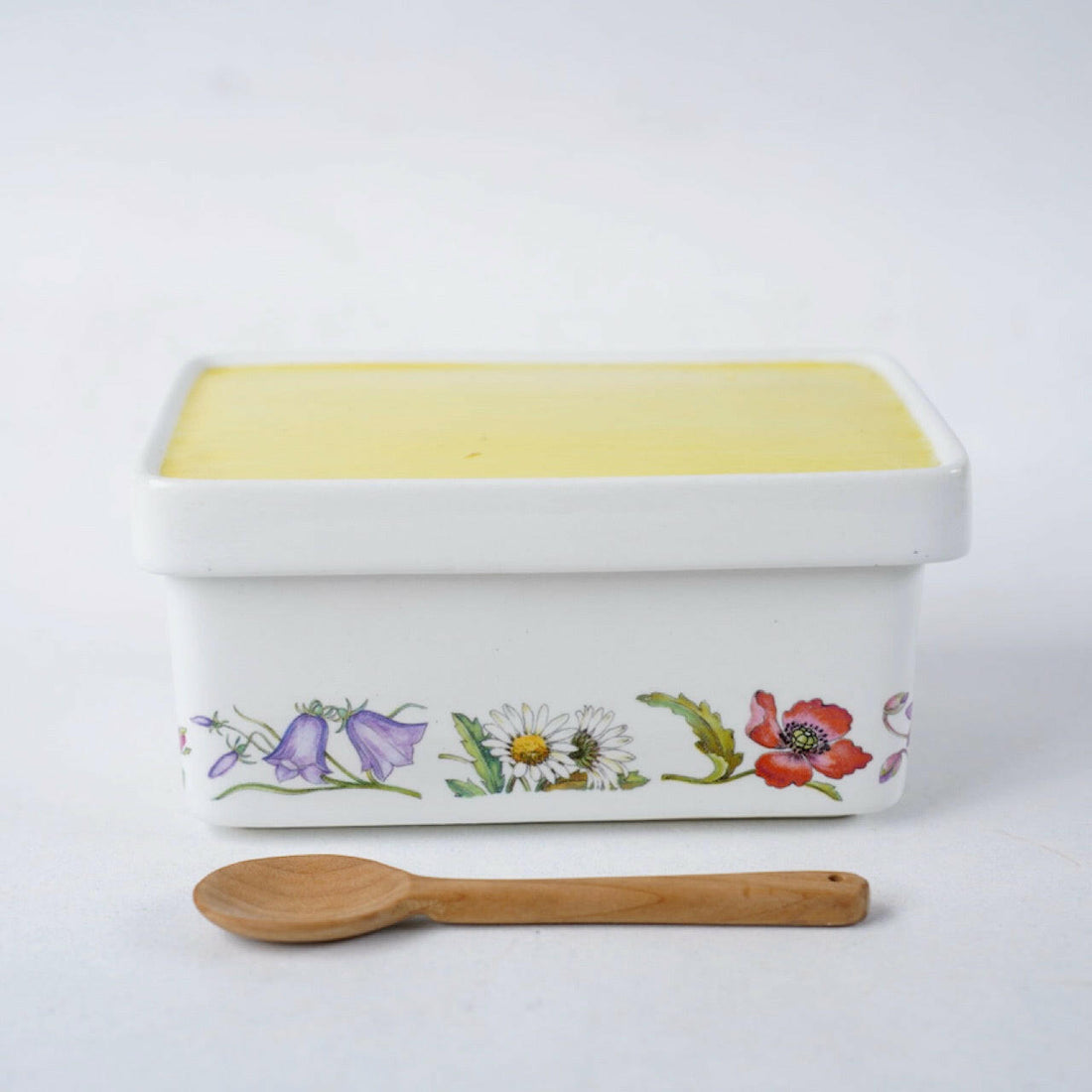 デコレーションには白いマーガレットや赤いヒナゲシ、紫色のスズランなど、北欧で最も日が長くハイシーズンであるミッドサマー(夏至)に咲く花が描かれています。フタは刷毛でざっと塗ったように黄色一色で彩られています。