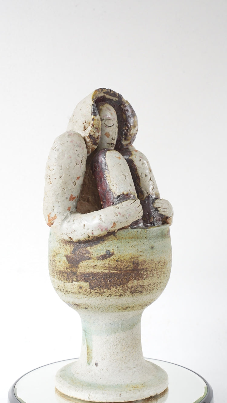 本作のとりわけ背面にシャモット炻器の特徴が表れており、顔のフードの部分はリサ・ラーソンの手跡が見られ、荒々しく整形されています。一見して不安定に見える部分も実際は堅牢な耐久性があります。また女性が入浴するワイングラスのバスタブ部分は胴体とは異なる釉薬が使われており、薄く青緑に発色している手の込みようです。
