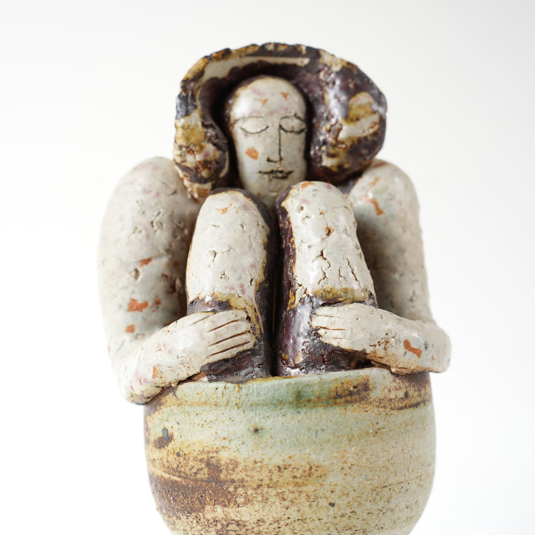 胴体は白く薄い釉薬で表現されており、伏目がちの微笑は入浴の心地良さが伝わる造形です。胴体内部は空洞になっており、焼成時に窯のなかで火がよく通るように計算された造りとなっています。そして丁寧に折りたたまれた膝や足元、顔のフード部分には濃い釉薬が塗られ、入浴中に差し込んだ光による陰影が丁寧に表現されています。