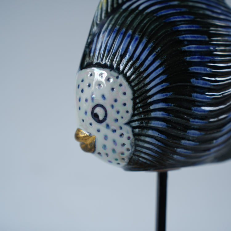 木製の土台に金属製の軸に伸び、熱帯魚のような鱗模様でふっくらとして化粧をしたような白い顔の魚がかわいらしく表現されています。よく見ると体をくねらせており空中を泳いでいるかのような表現されています。リサ・ラーソン作品のなかでは珍しく木や鉄といった材料を使用している点も特徴的です。