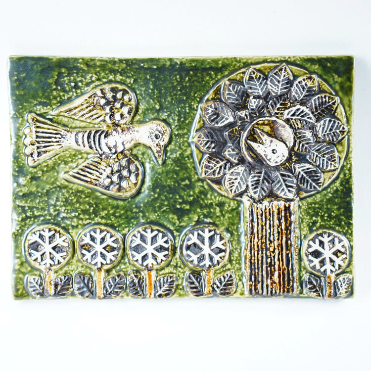 リサ・ラーソンがグスタフスベリのGスタジオで1960年頃に約100点ほど製造された鳥の陶板です。巣に舞い戻る親鳥と待ち構えるひな鳥が描かれています。緑色の釉薬で彩られた低い草木の上を軽快に飛ぶ鳥の姿と、鳥の巣が円形状に表現されているのが印象的な作品です。