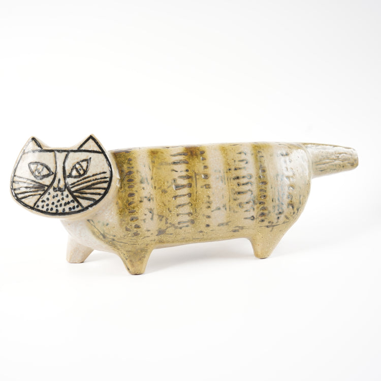 キジ猫のような毛並みで、しっとりとした釉薬の質感が落ち着きを与え、可愛らしい口元とぴんと横に張ったしっぽが歩きながらふいにこちらを向いたような自然さを感じさせます。後ろから見たときのお尻も丸みがとてもキュートで、お尻を振りながら歩く猫の特徴がよく現れています。リサ・ラーソンには複数の猫作品がありますが、最初期の作品でありヴィンテージのなかでも傑出した出来栄えの陶器像です。