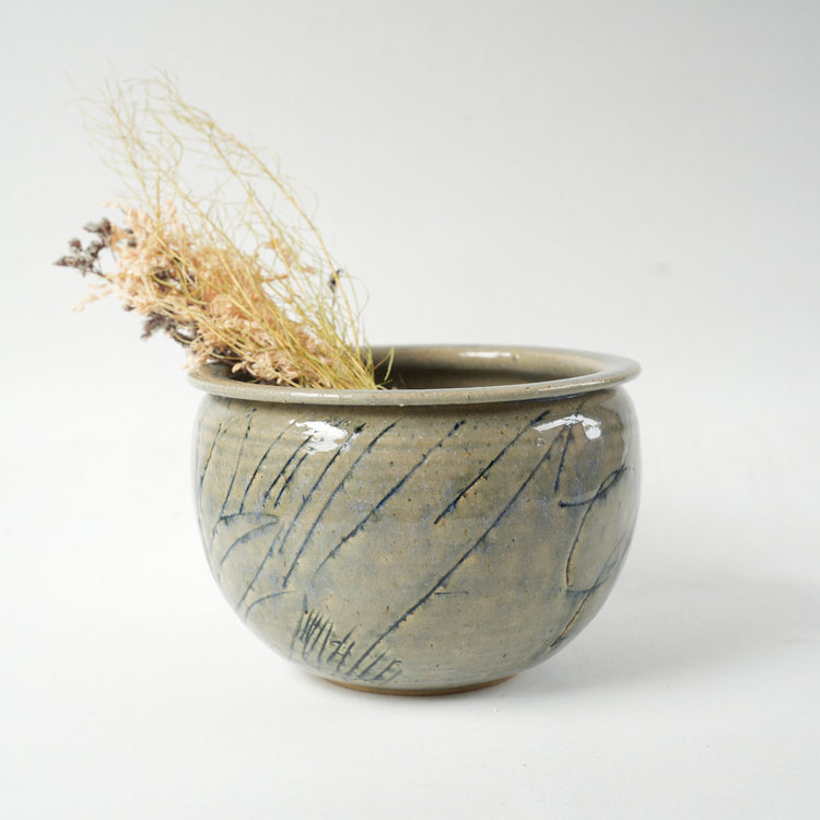 全体は小ぶりなバレーボールほどのサイズ感です。内部に土を詰めて植物を育てるために制作されたものですが、茶道具の建水のような使い途もあるかと思います。全体に釉薬が滑らかにかかり、わずかに紫色の光沢を帯びています。照明の当たり具合で表情にも変化が感じられます。側面にはススキのような紋様が描かれ、大地に伸びる植物が風に吹かれてなびく姿が表現された躍動感のある作品です。
