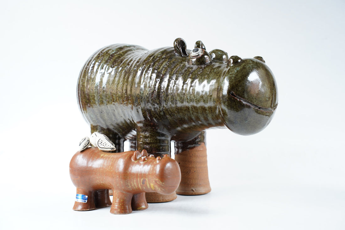 今回紹介するユニークピースのカバの陶器像は、それに先立つ年(おそらく1965年頃)にスタジオ用のサンプルとしてリサ・ラーソンが制作したものです。まだ最終的なデザインが決定していない段階のプロトタイプ的な作品であり、鳥が背中に乗っていなかったり、足の長さや胴体の色が異なるなど量販品との違いが伺えます。アトリエでは本作を元にして、量販品のデザインが決定され大量生産に適したモディファイが行われることになります。