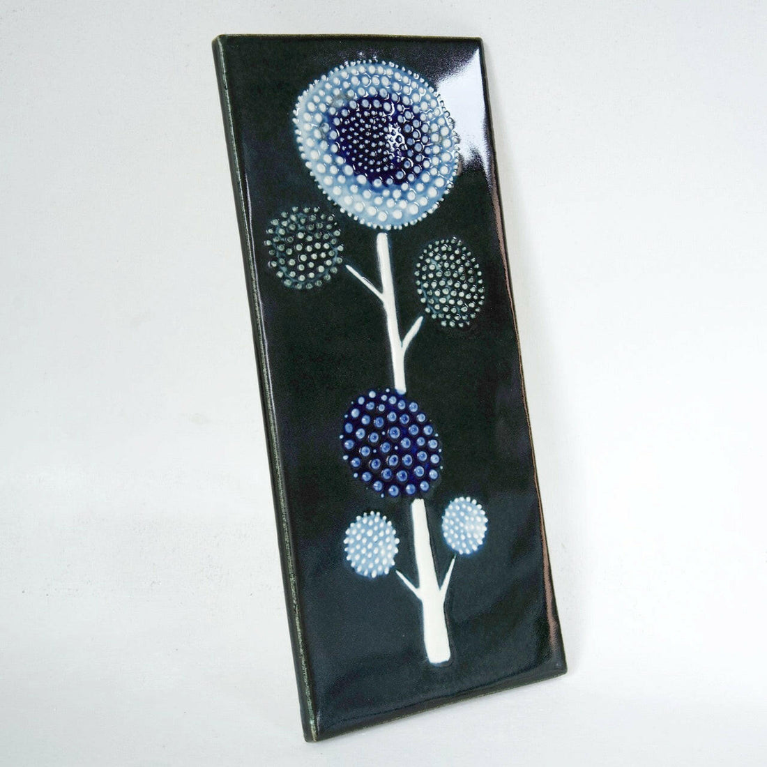 スウェーデンの著名な陶芸家として20世紀(1915年~2003年)に名を馳せたのは、シルヴィア・レウショヴィウスのひまわりをモチーフにした陶板です。北欧の陶板といえばリサ・ラーソンが有名ですが、1950年代から1970年代の間、レウショヴィウスも独自の陶板デザインを手がけていました。その作品は愛らしい動物や草木を中心にデザインされています。こちらはひまわりを独自の色彩感覚で、青く表現した作品です。厚く塗られた背景の黒い釉薬が光を鈍く反射し、青く冷たい感じがするひまわりがかえって白く暖かく見えるように工夫をされています。リサ・ラーソンとは異なり、シルヴィアの作品はあまり市場に出回らない希少なものとなっています。