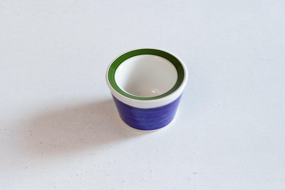 スウェーデンの名窯ロールストランドのイレーネのエッグカップです。イレーネは20世紀のロールストランド社を代表する鮮やかなハンドペイントの器です。イレーネシリーズは無骨なデザインが多いロールストランドの60〜70年代の食器のなかで、薄造りで製造された高級路線のシリーズです。カップ、プレート、ピッチャー、どれをとっても軽やかで取り回しがしやすくデザインされています。白の釉薬をベースにした本体に鮮やかな青と緑のペイントで明るい色付けがされ、冬の日が多い北欧の食卓を豊かに彩る工夫が感じられます。