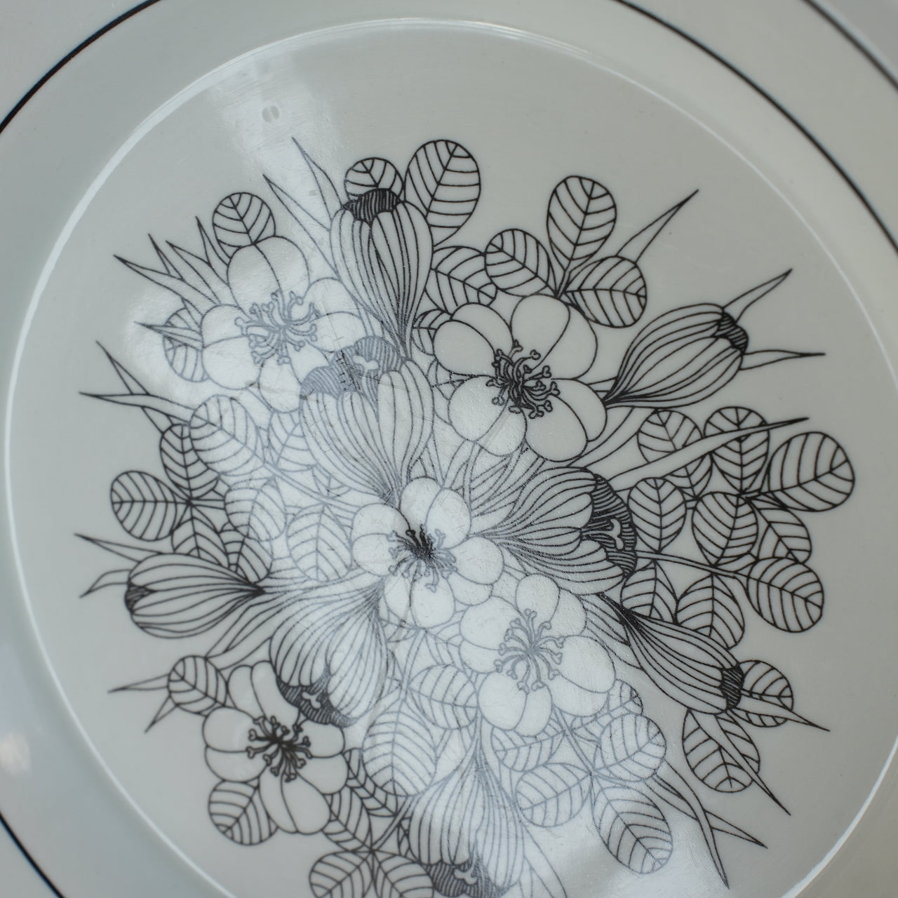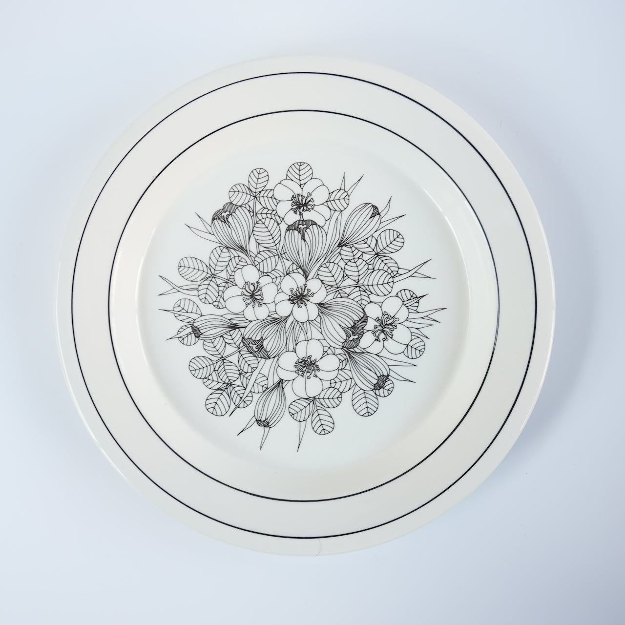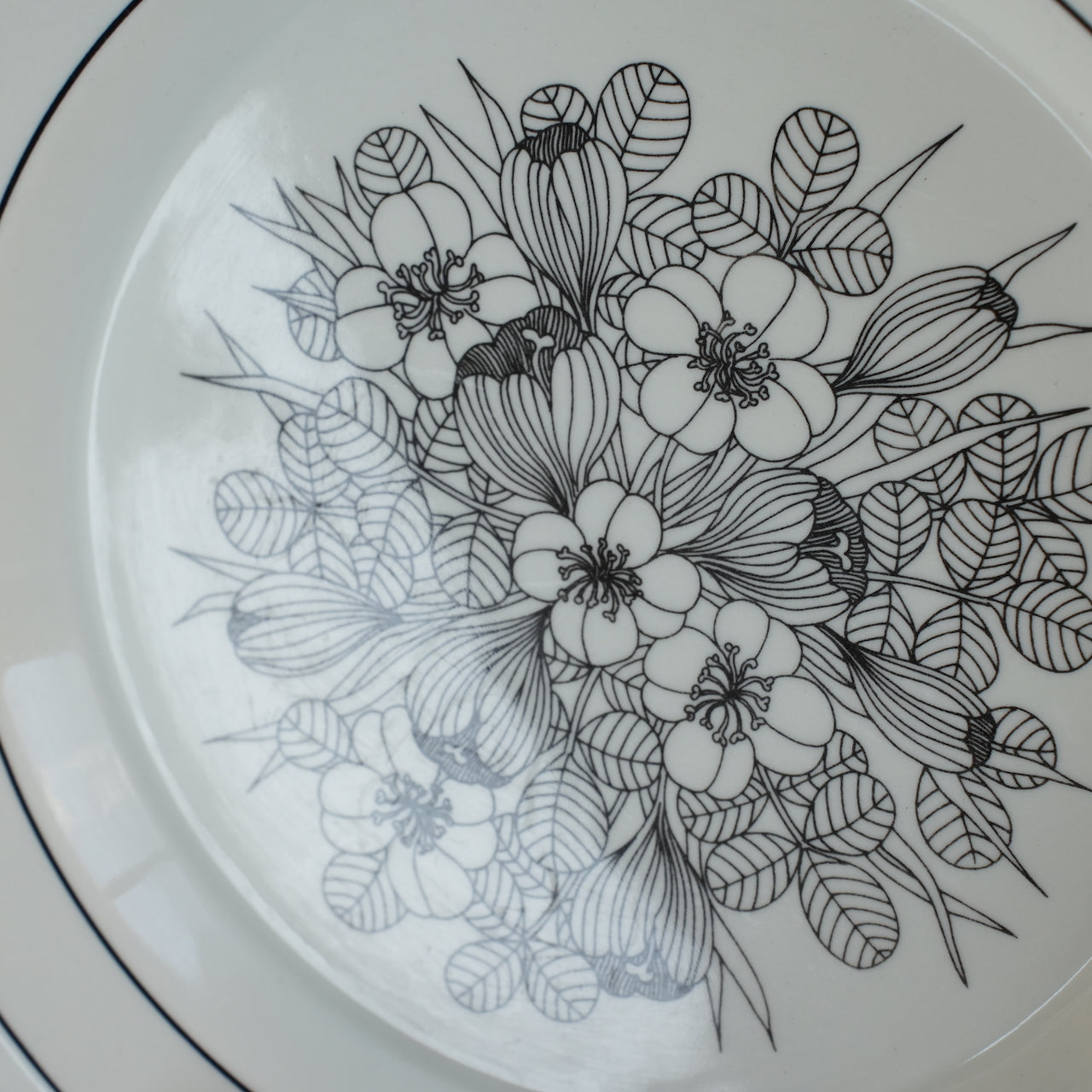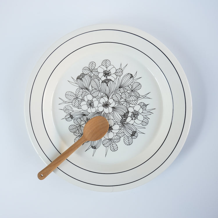 这是芬兰顶级餐具制造商 ARABIA 出品的传奇之作——番红花(Crocus)系列。番红花是一种鸢尾花。番红花餐盘有三种款式:黑白款、彩色款和灰边款。图中所示为黑白款。番红花系列仅在 1978 年至 1979 年间生产了两年。近年来,该系列的马克杯、碗和 17 厘米餐盘均有复刻版问世。