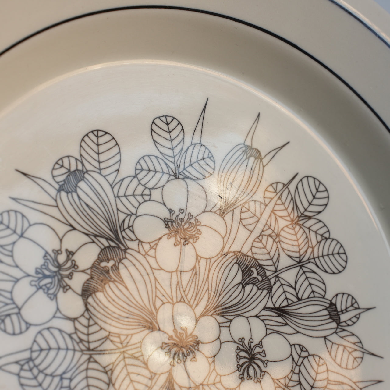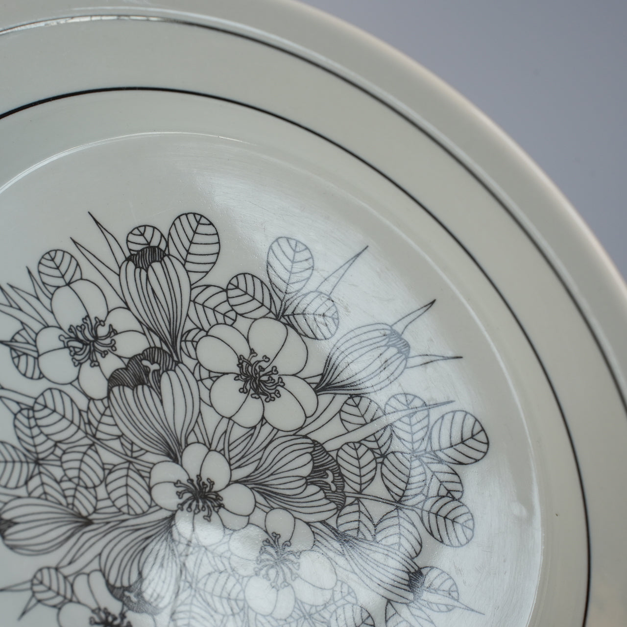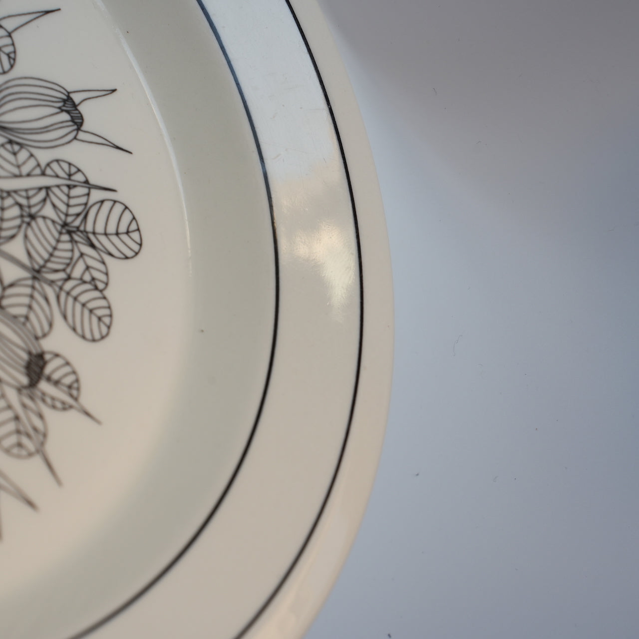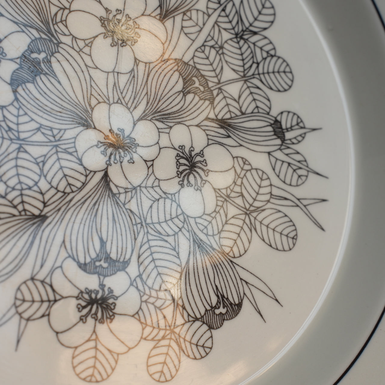 这是芬兰顶级餐具制造商 ARABIA 出品的传奇之作——番红花(Crocus)系列。番红花是一种鸢尾花。番红花餐盘有三种款式:黑白款、彩色款和灰边款。图中所示为黑白款。番红花系列仅在 1978 年至 1979 年间生产了两年。近年来,该系列的马克杯、碗和 17 厘米餐盘均有复刻版问世。