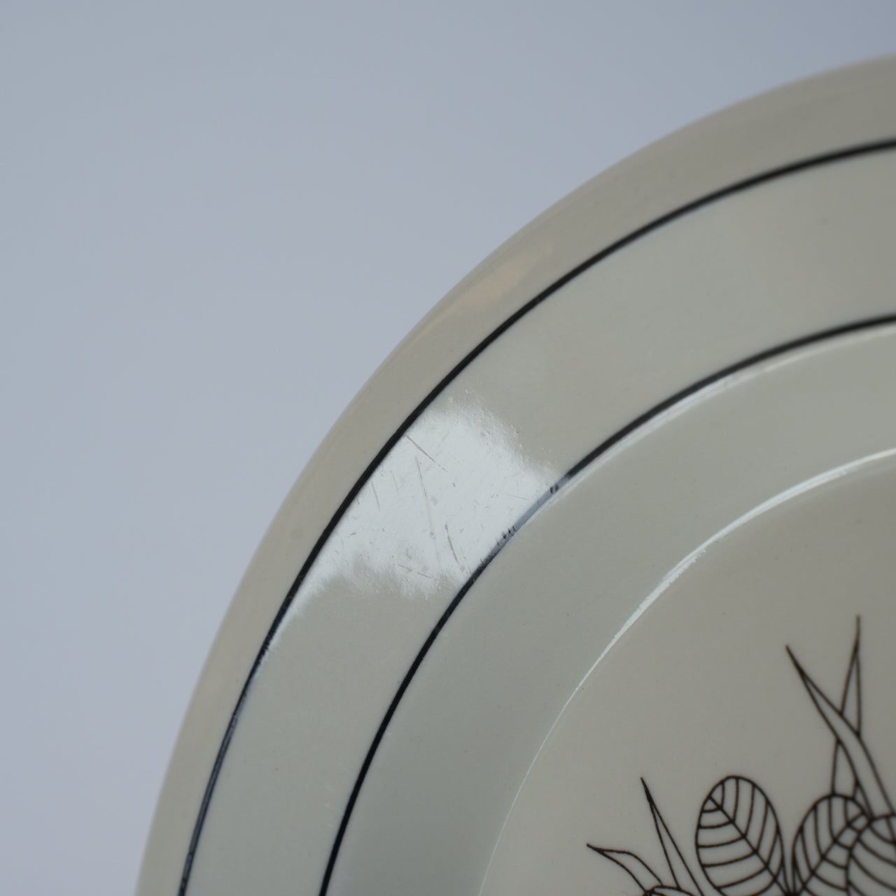 表面有刀叉划痕,边缘有堆叠痕迹,对着光线观察可见。无裂纹、缺口或釉裂,品相极佳,保留了原有的外观。