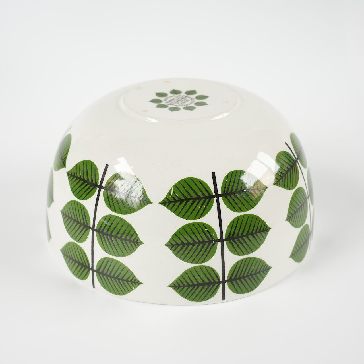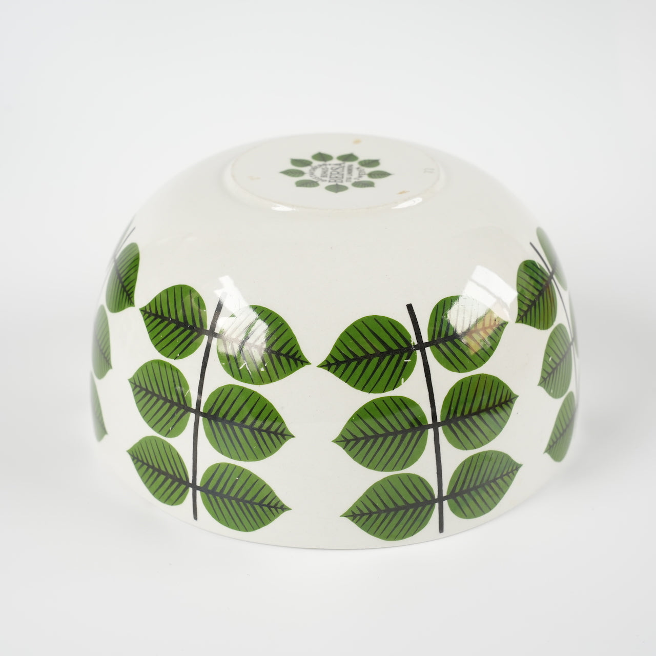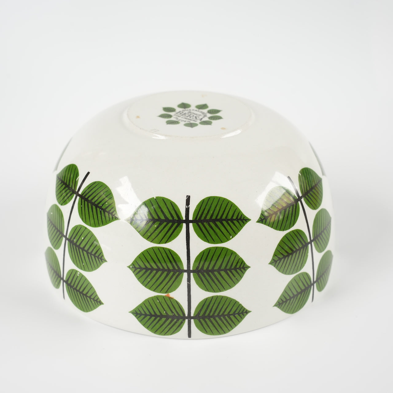 大多数老式Versa碗都是圆柱形的,因此这种碗状碗非常罕见。市面上也有仿制品,但都是圆形的,而且只在碗内作画,外侧没有叶子图案。碗状碗有三种尺寸:大号、中号和小号(分别为17.5厘米、15厘米和12厘米),这款是中号,直径15厘米。