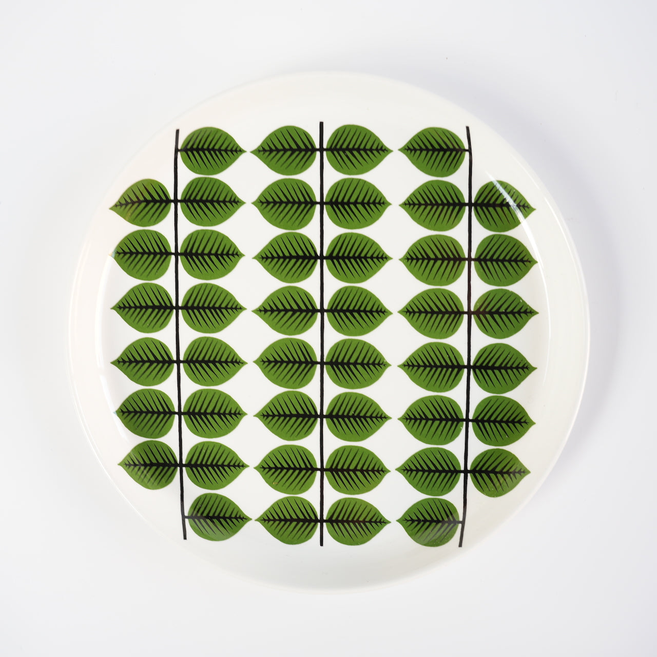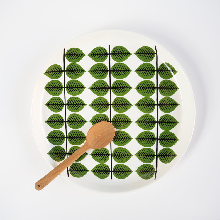 这是一件来自瑞典老牌餐具制造商Gustavsberg的经典Bersa餐盘。这款叶纹图案由Stig Lindberg于1961年设计。这是一件复古单品。Bersa(或“bersjö”)意为凉亭,是公园一角供人休憩的场所。这款温暖的设计让人联想起斯堪的纳维亚半岛的清新绿意,那里冬季漫长。