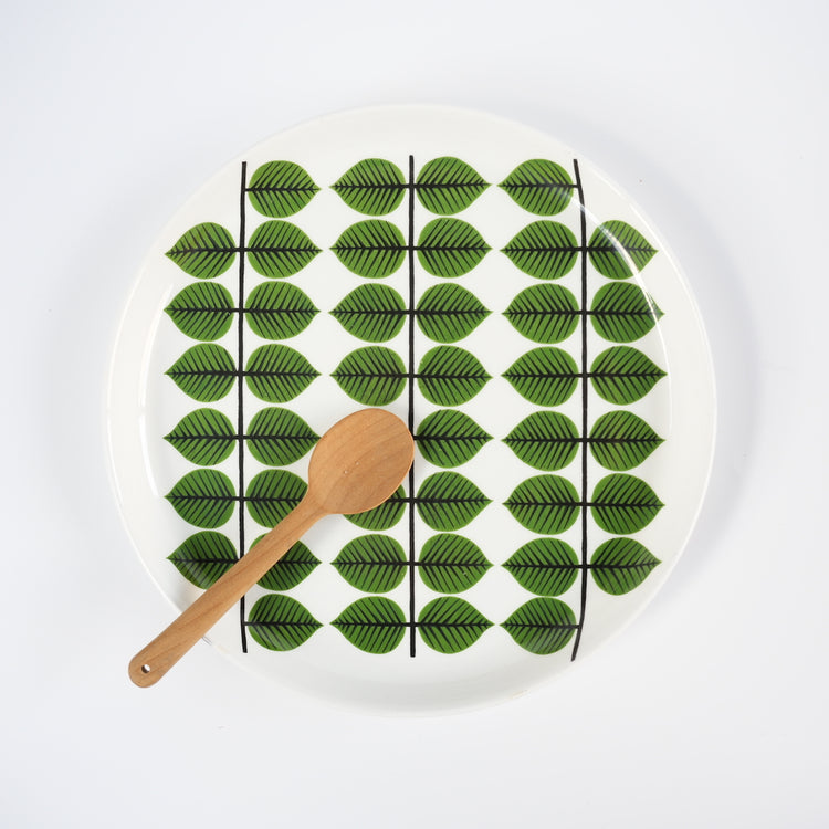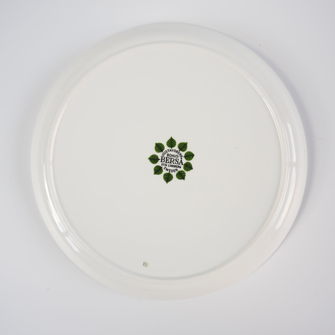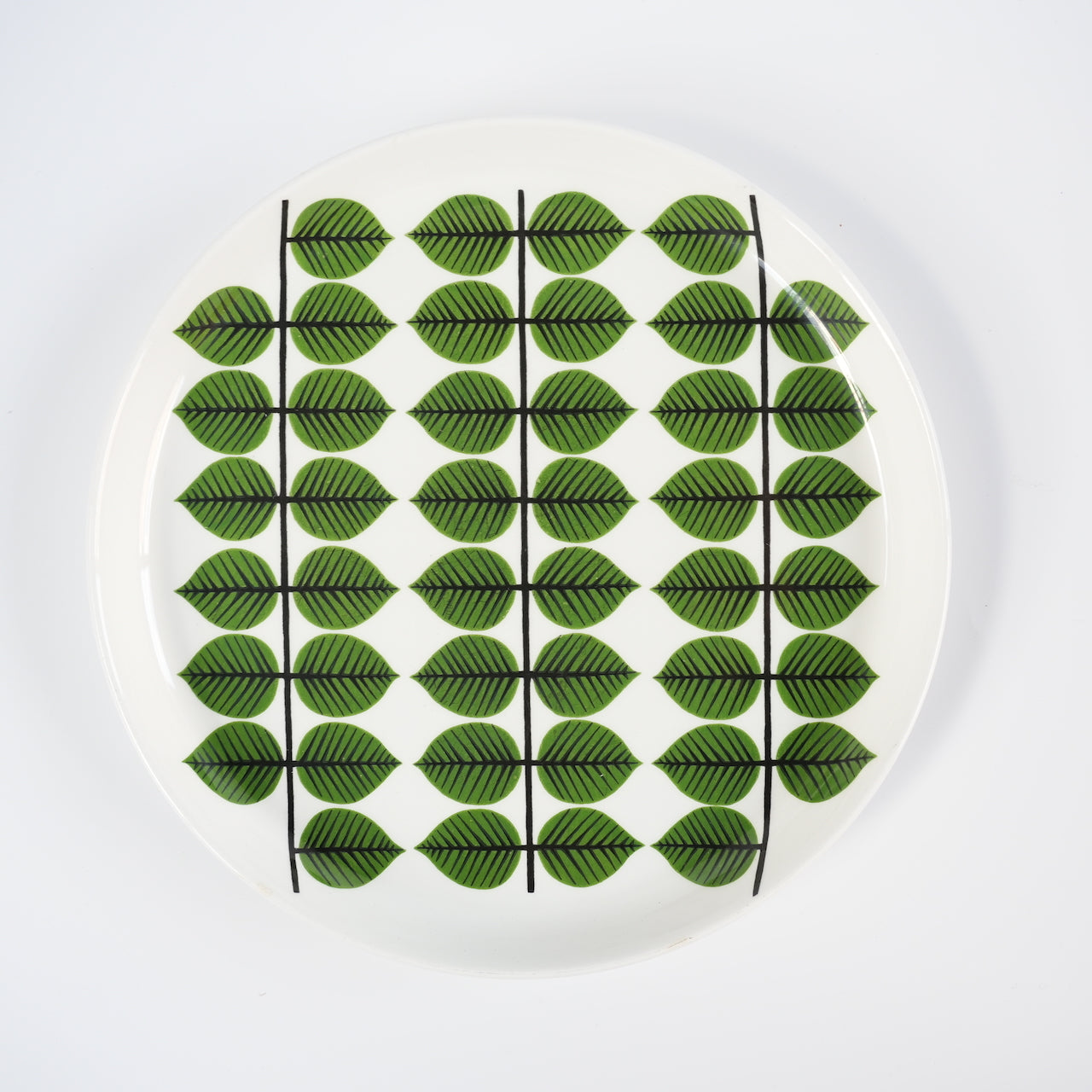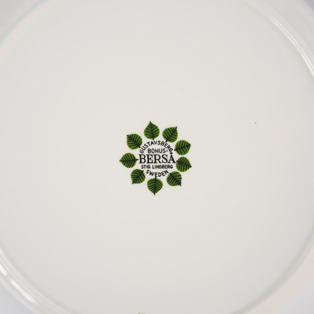 这是一件来自瑞典老牌餐具制造商Gustavsberg的经典Bersa餐盘。这款叶纹图案由Stig Lindberg于1961年设计。这是一件复古单品。Bersa(或“bersjö”)意为凉亭,是公园一角供人休憩的场所。这款温暖的设计让人联想起斯堪的纳维亚半岛的清新绿意,那里冬季漫长。