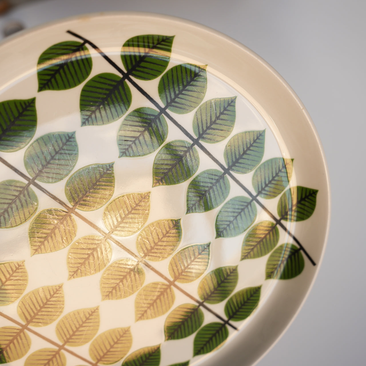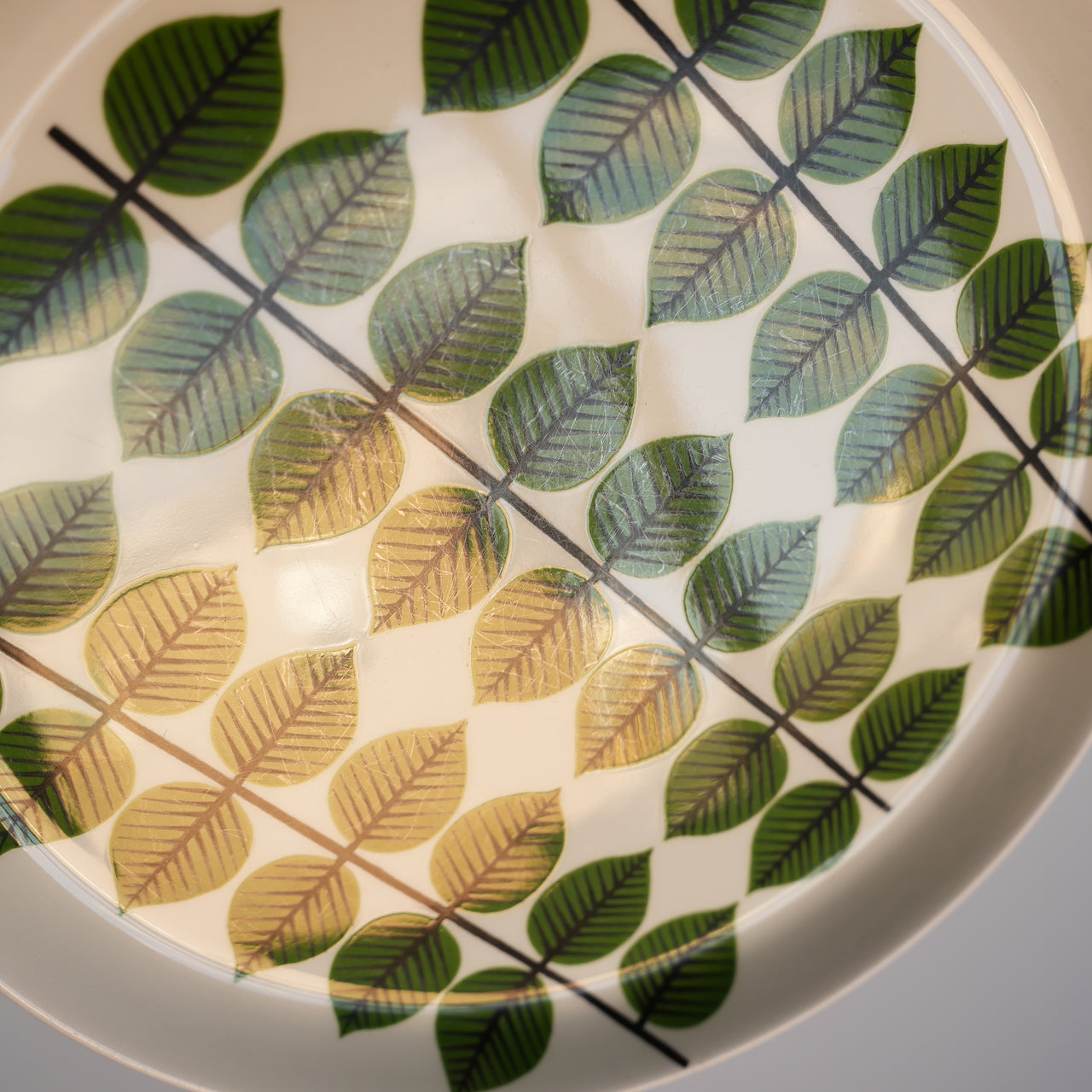 Versa 餐盘也有复刻版,但主要区别在于叶片图案的翠绿色调。复刻版的绿色比原版更浅。原版餐盘的另一个特点是边缘略微凸起。而复刻版则呈碗状,从中心向边缘逐渐变圆。