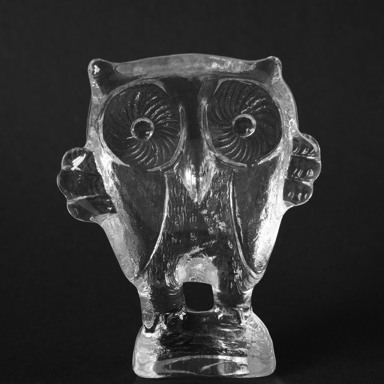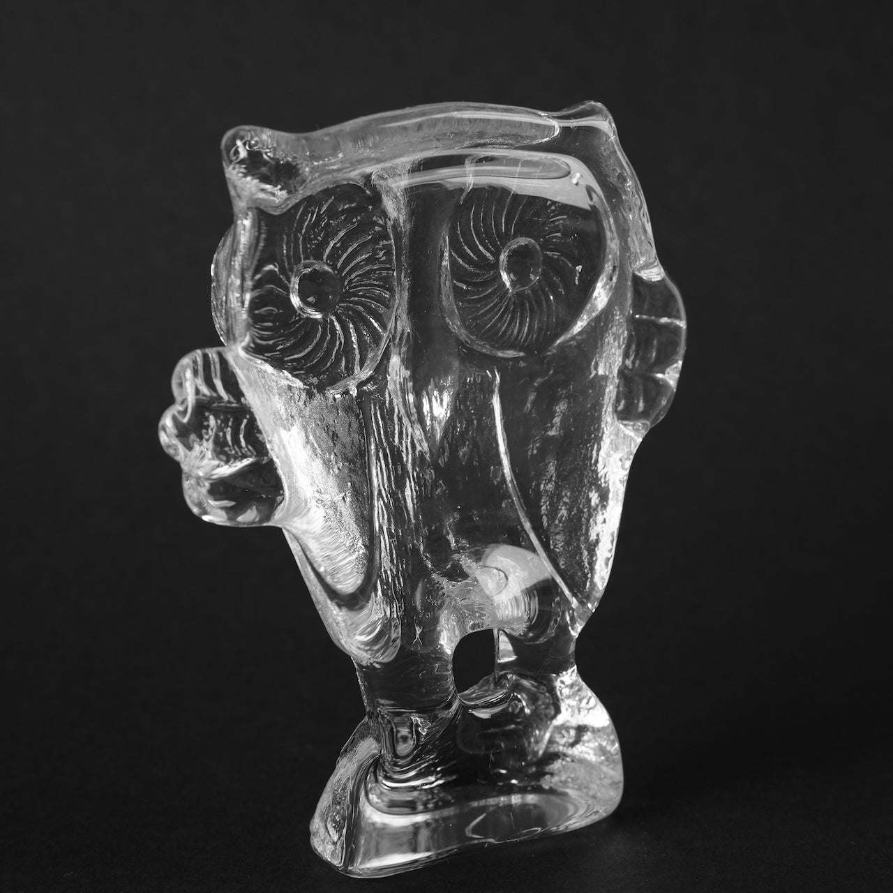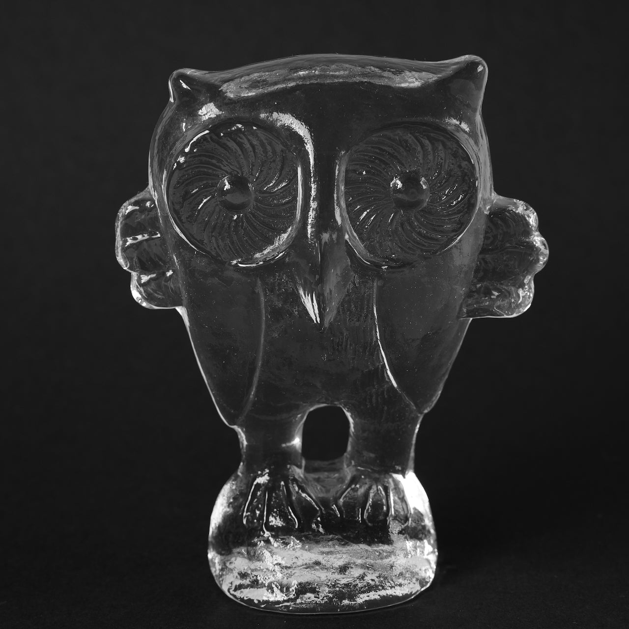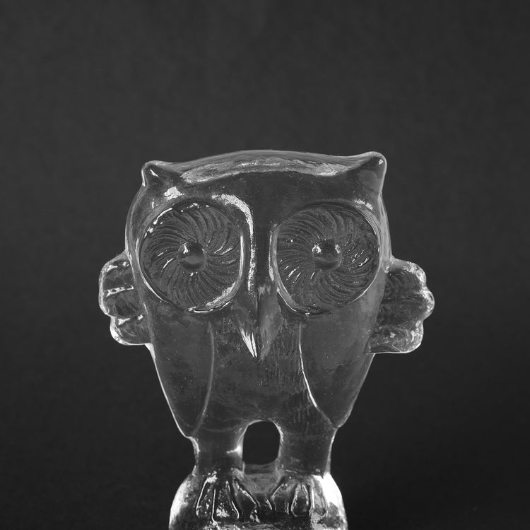 这件由科斯塔·博达(Kosta Boda)创作的玻璃制品由维特尔·瓦伦(Vettel Valeen)设计。猫头鹰的造型栩栩如生,硕大的眼睛直视前方,双翼向两侧舒展,就连爪子的形状也与光线融为一体,在透明玻璃中投射出斑驳的光影。它的轮廓在黑色背景的衬托下格外醒目,而内部的气泡和纹理在自然光下呈现出不同的形态,随着光线明暗的变化,呈现出迷人的视觉效果。