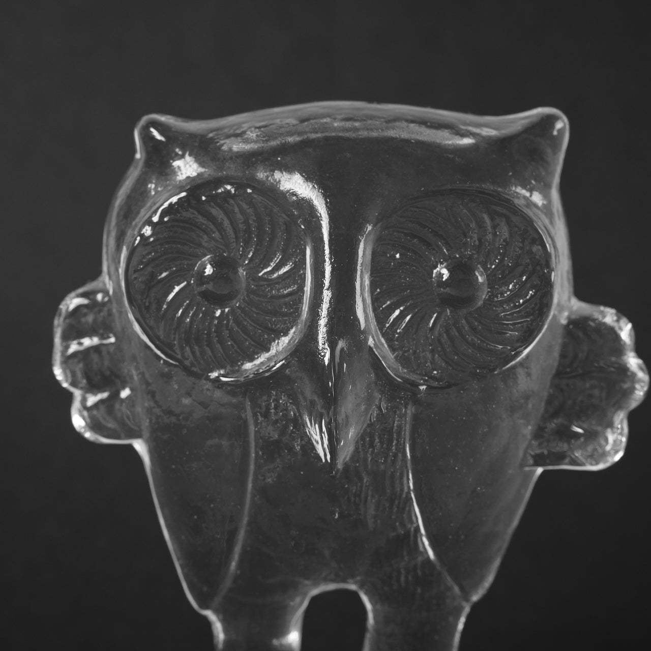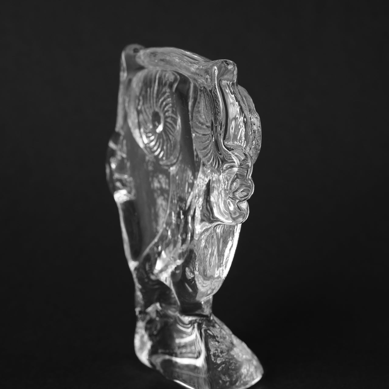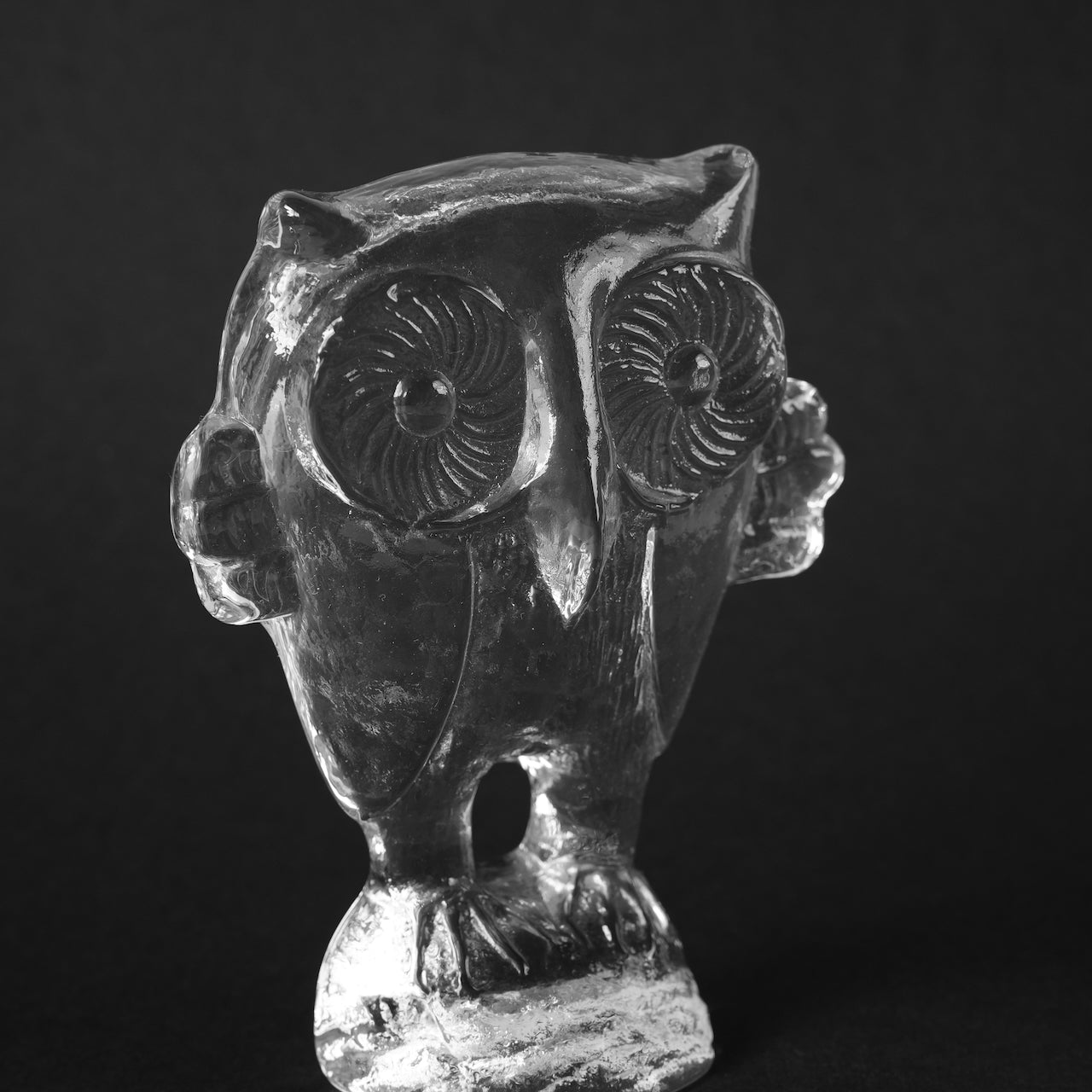 这件由科斯塔·博达(Kosta Boda)创作的玻璃制品由维特尔·瓦伦(Vettel Valeen)设计。猫头鹰的造型栩栩如生,硕大的眼睛直视前方,双翼向两侧舒展,就连爪子的形状也与光线融为一体,在透明玻璃中投射出斑驳的光影。它的轮廓在黑色背景的衬托下格外醒目,而内部的气泡和纹理在自然光下呈现出不同的形态,随着光线明暗的变化,呈现出迷人的视觉效果。