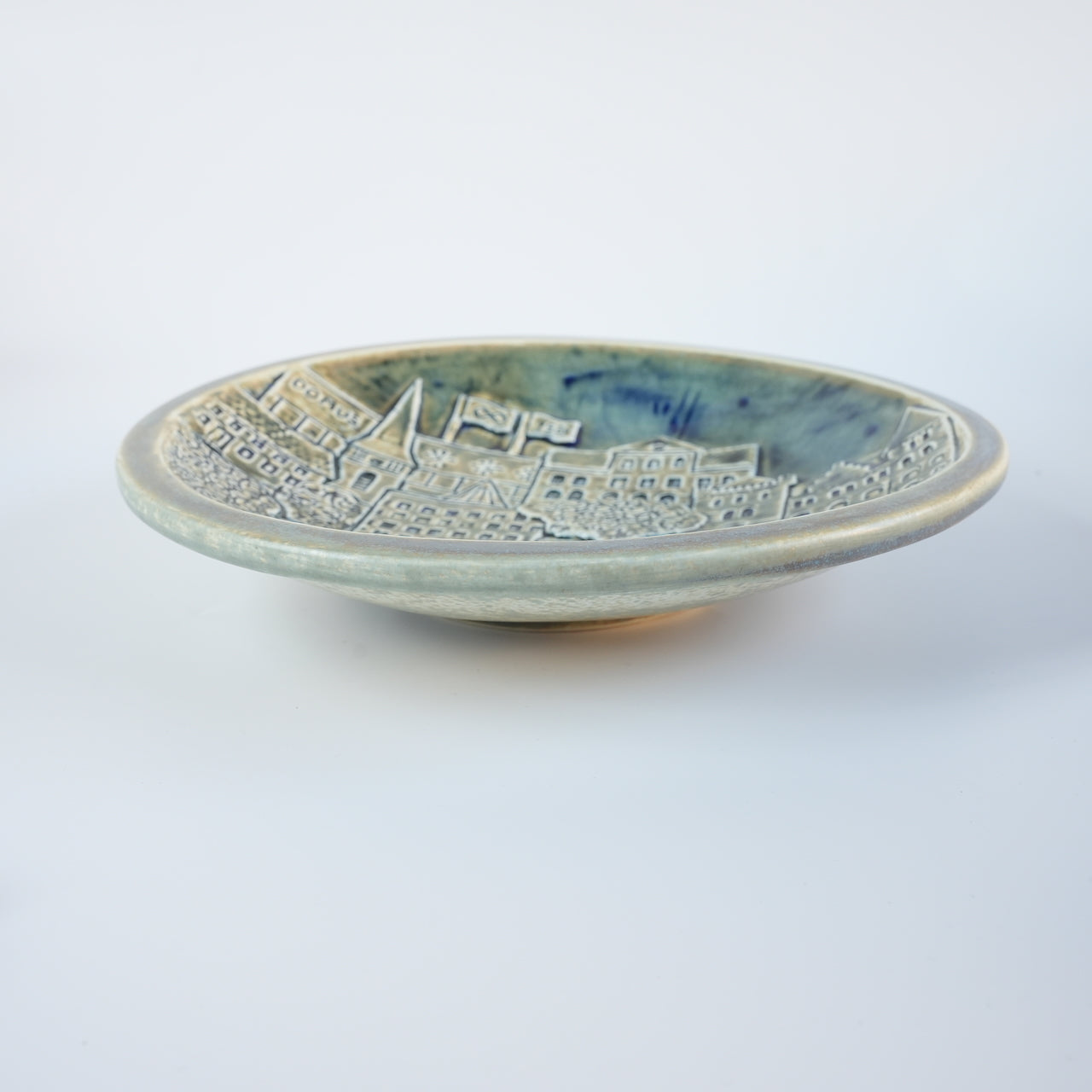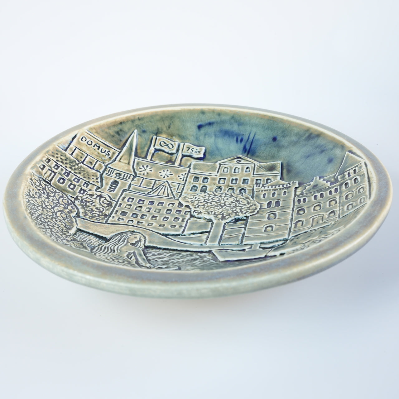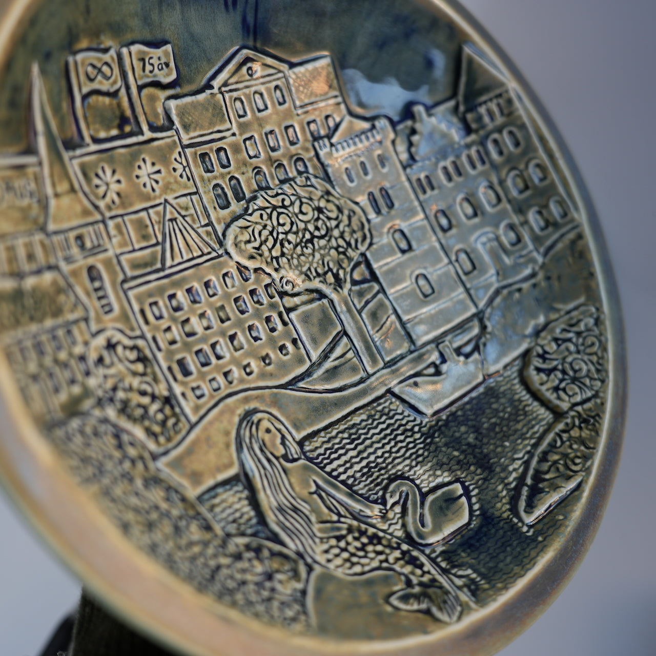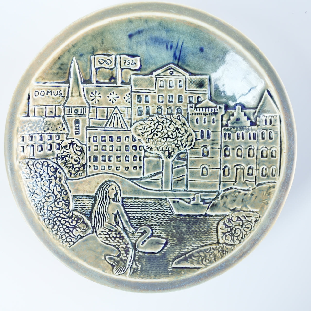 盘子正面印有古斯塔夫斯贝格大楼的图案,这家历史悠久的瑞典陶瓷制造商曾是丽莎·拉尔森工作多年的公司。古斯塔夫斯贝格位于海滨,是水路运输餐具的理想地点。该公司的标志以锚为特色,盘子上还绘有船只和美人鱼,进一步突出了这一点。