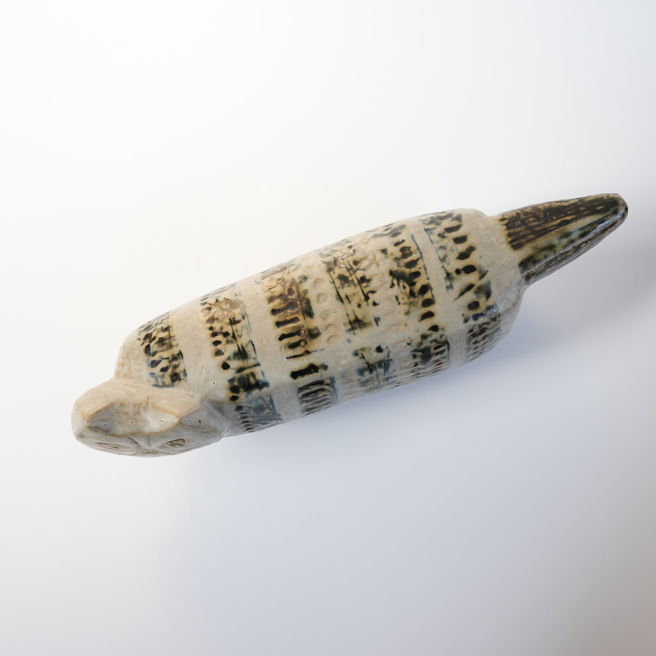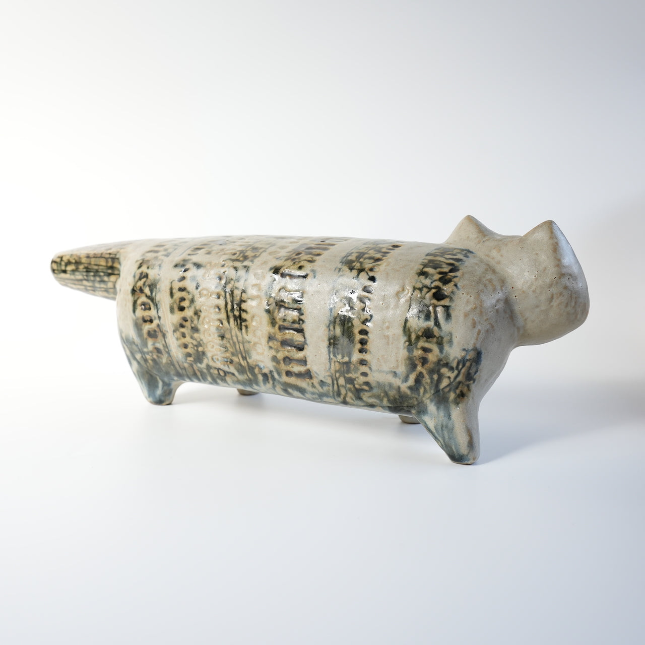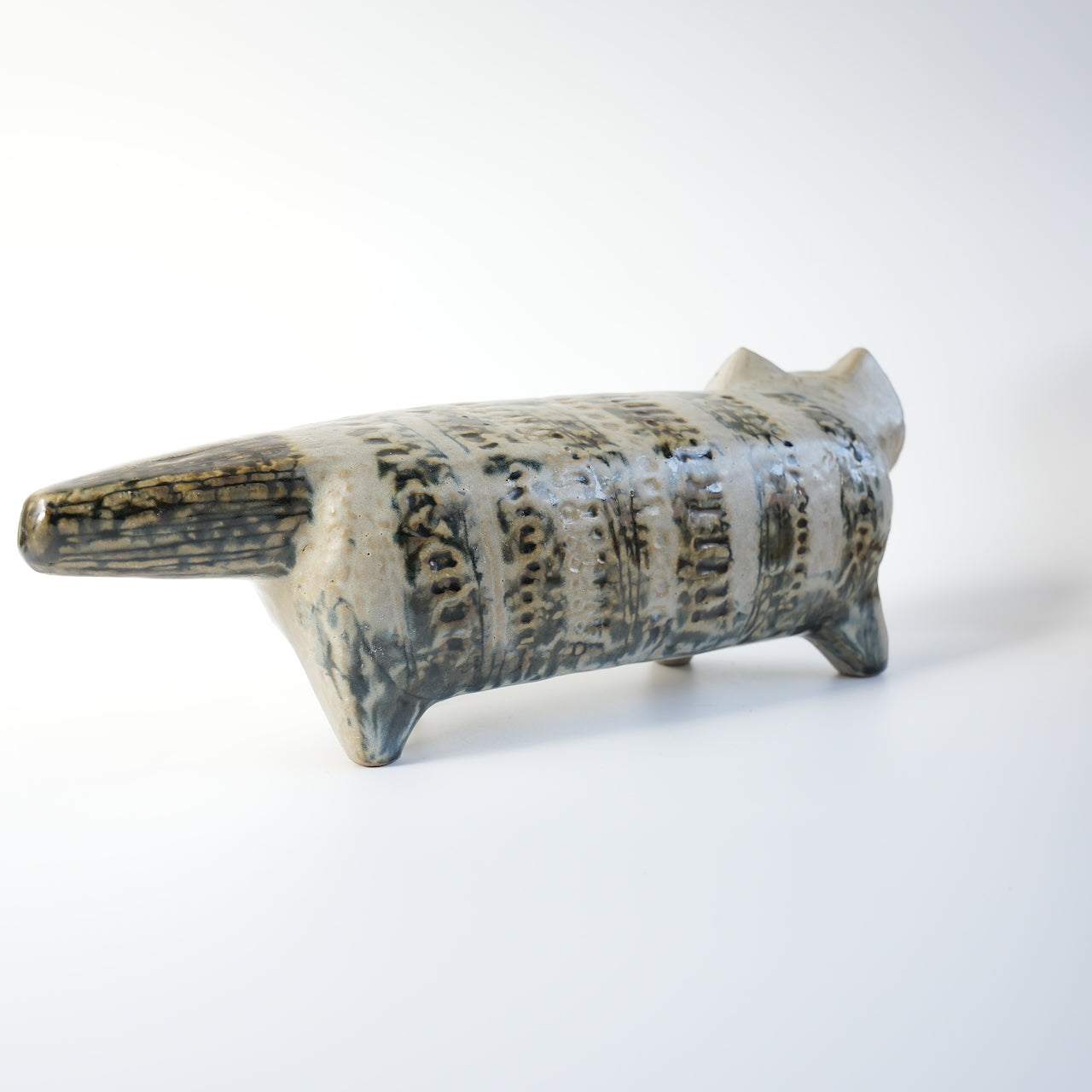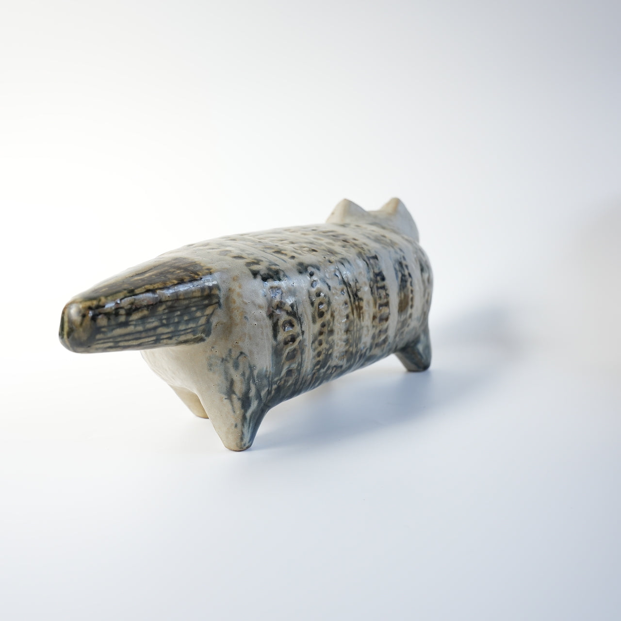 这件作品很可能制作于1958年之前,也就是“大动物园”系列玩具问世的那一年。与普通版不同,它的底部几乎没有气孔,腹部刻有Lisa Larson的印章。整体颜色是粗略涂抹的黑色釉面,带有水平线条,部分地方的陶土被挖空,露出白色的底色。面部线条非常模糊,表明当时这个产品的概念尚未确立。