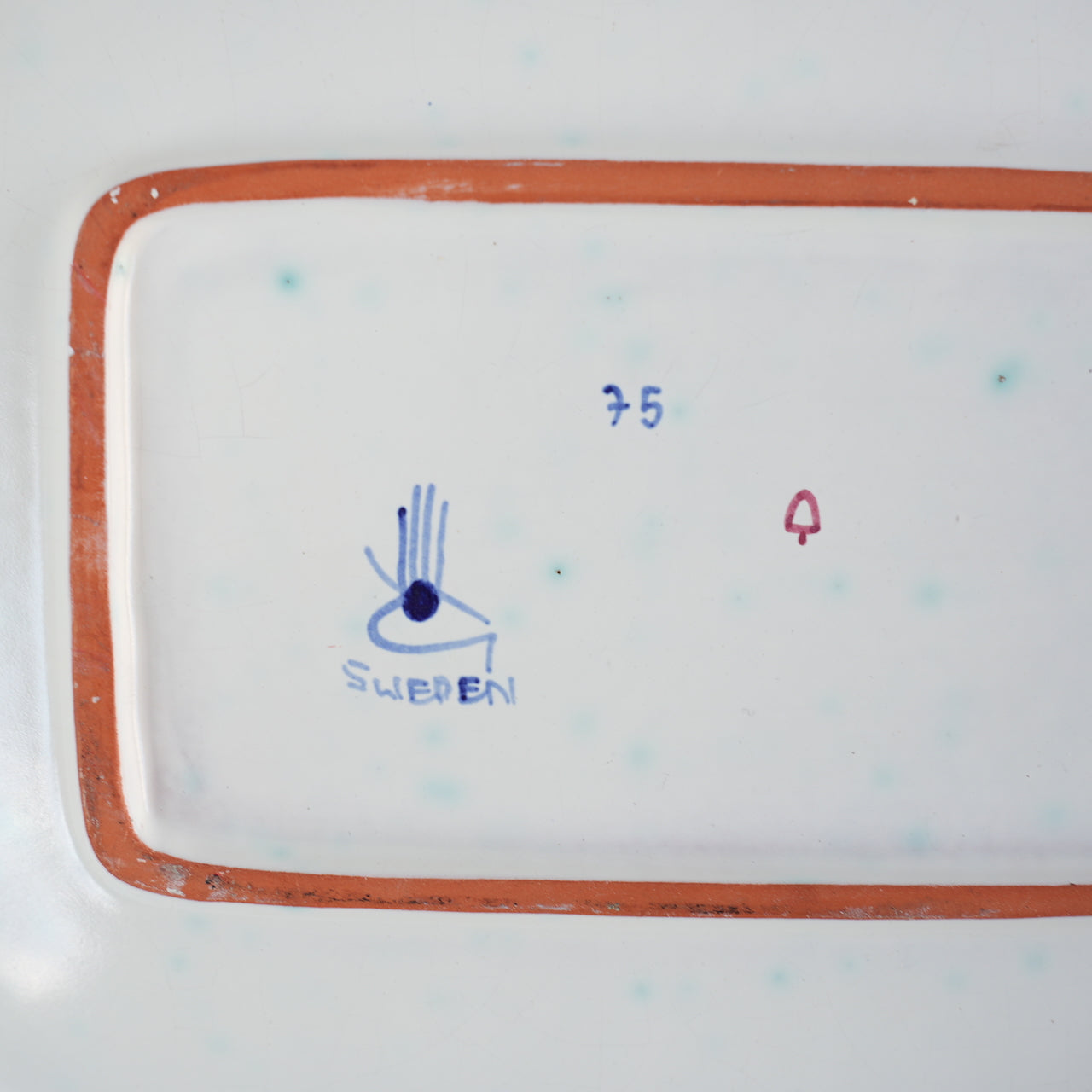盘子背面有一个 G 手形标志,表明它是在古斯塔夫斯堡的 G 工作室制作的。