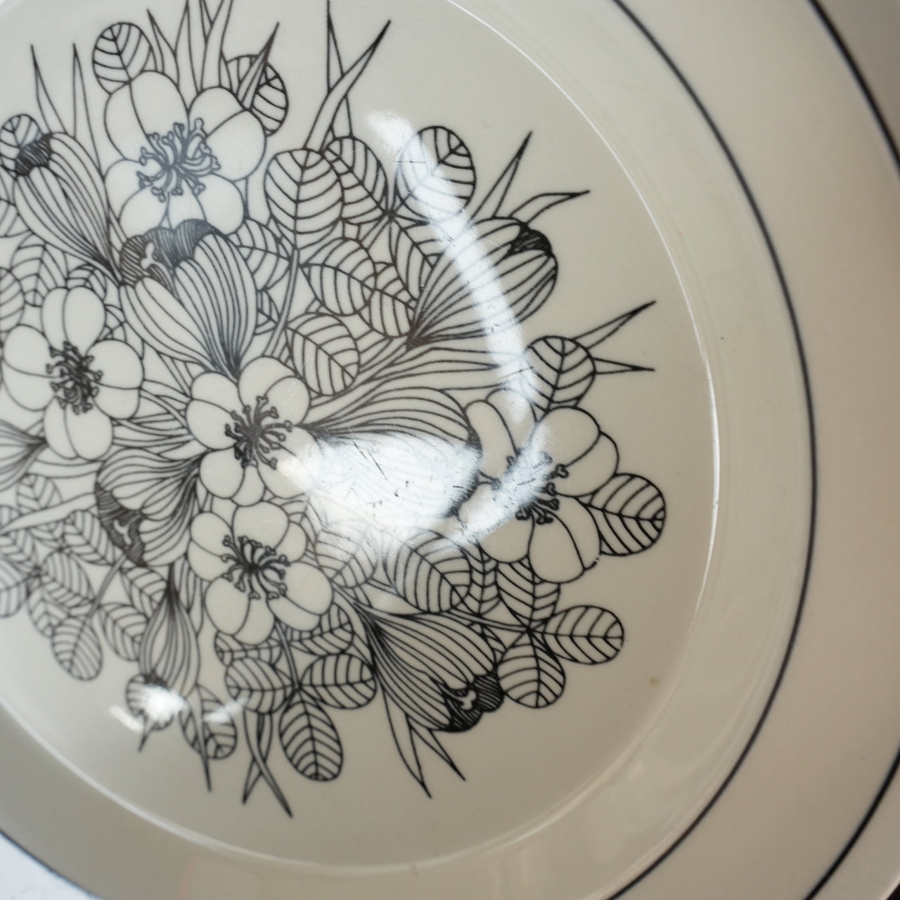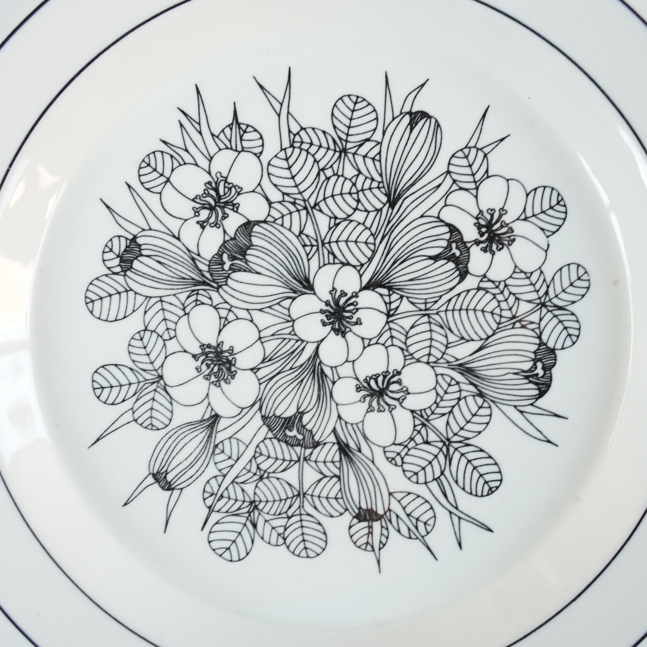 这是芬兰顶级餐具制造商 ARABIA 出品的传奇之作——番红花(Crocus)系列。番红花是一种鸢尾花。番红花餐盘有三种款式:黑白款、彩色款和灰边款。图中所示为黑白款。番红花系列仅在 1978 年至 1979 年间生产了两年。近年来,该系列的马克杯、碗和 17 厘米餐盘均有复刻版问世。